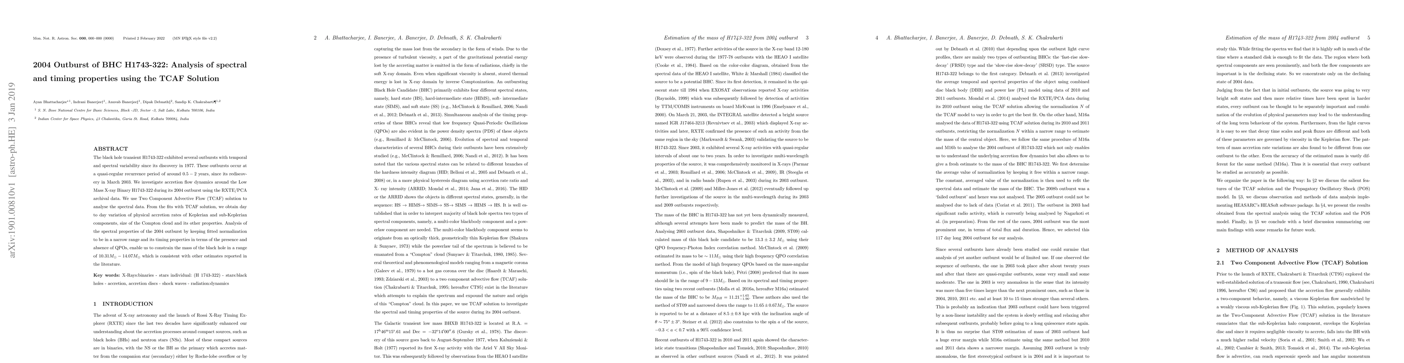 The black hole transient H1743-322 exhibited several outbursts with temporal and spectral variability since its discovery in 1977. These outbursts occur at a quasi-regular recurrence period of around $0.5-2$ years, since its rediscovery in March 2003. We investigate accretion flow dynamics around the Low Mass X-ray Binary H1743-322 during its 2004 outburst using the RXTE/PCA archival data. We use Two Component Advective Flow (TCAF) solution to analyse the spectral data. From the fits with TCAF solution, we obtain day to day variation of physical accretion rates of Keplerian and sub-Keplerian components, size of the Compton cloud and its other properties. Analysis of the spectral properties of the 2004 outburst by keeping fitted normalization to be in a narrow range and its timing properties in terms of the presence and absence of QPOs, enable us to constrain the mass of the black hole in a range of $10.31 M_{\odot} - 14.07 M_{\odot}$ which is consistent with other estimates reported in the literature.