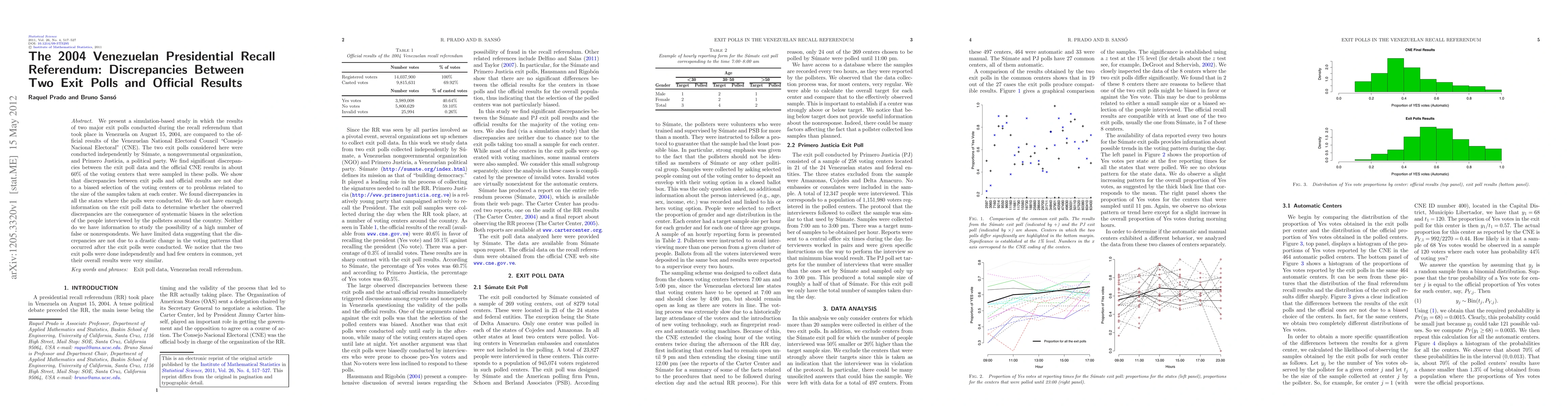 This study simulates a comparison between two independent exit polls and official results from Venezuela's 2004 recall referendum, finding significant discrepancies in 60% of sampled centers. The discrepancies aren't attributed to biased selection or sample size issues, yet the cause remains undetermined due to insufficient data.