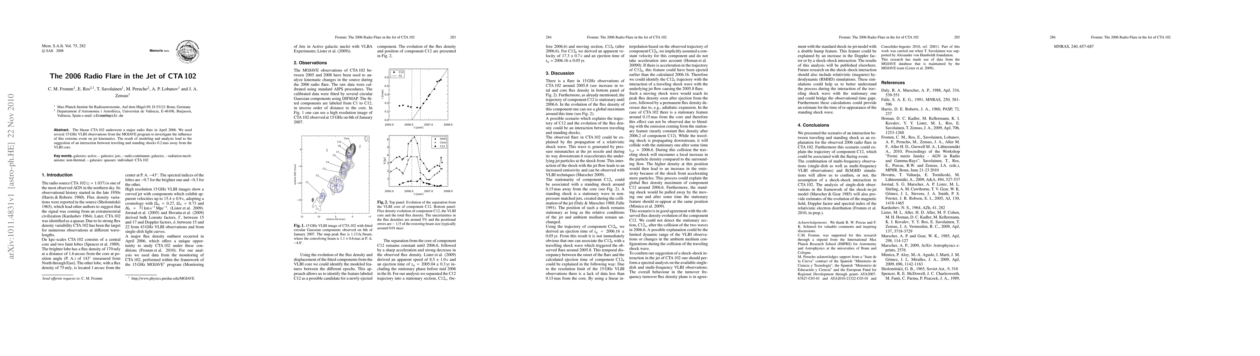 In 2006, the blazar CTA 102 experienced a significant radio flare. VLBI observations from the MOJAVE program revealed that this event likely resulted from an interaction between traveling and standing shocks, 0.2 mas from the VLBI core, affecting jet kinematics.