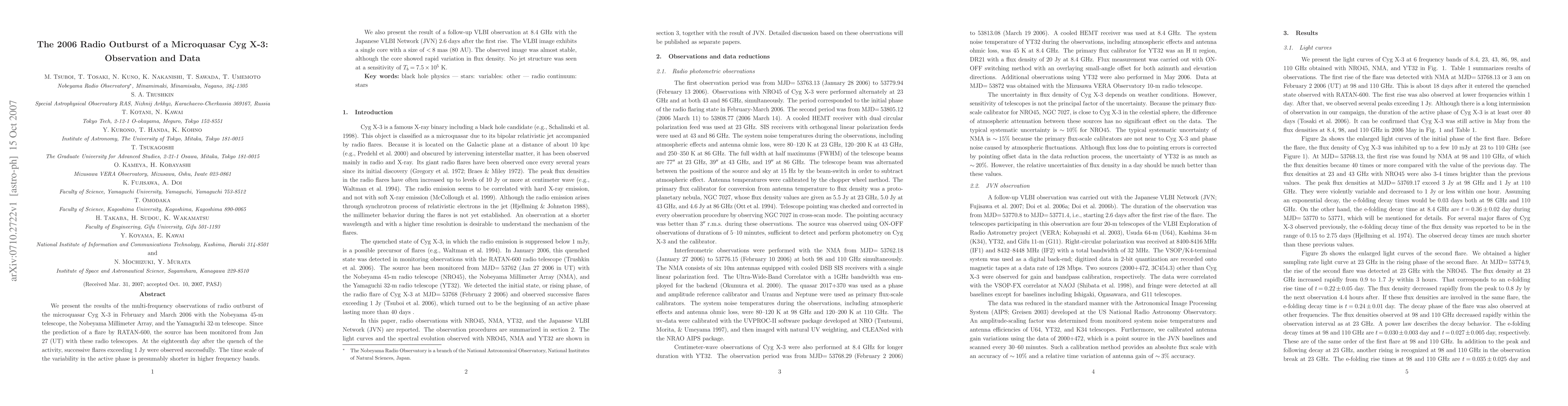 We present the results of the multi-frequency observations of radio outburst of the microquasar Cyg X-3 in February and March 2006 with the Nobeyama 45-m telescope, the Nobeyama Millimeter Array, and the Yamaguchi 32-m telescope. Since the prediction of a flare by RATAN-600, the source has been monitored from Jan 27 (UT) with these radio telescopes. At the eighteenth day after the quench of the activity, successive flares exceeding 1 Jy were observed successfully. The time scale of the variability in the active phase is presumably shorter in higher frequency bands. We also present the result of a follow-up VLBI observation at 8.4 GHz with the Japanese VLBI Network (JVN) 2.6 days after the first rise. The VLBI image exhibits a single core with a size of <8 mas (80 AU). The observed image was almost stable, although the core showed rapid variation in flux density. No jet structure was seen at a sensitivity of $T_b = 7.5\times 10^5$ K.