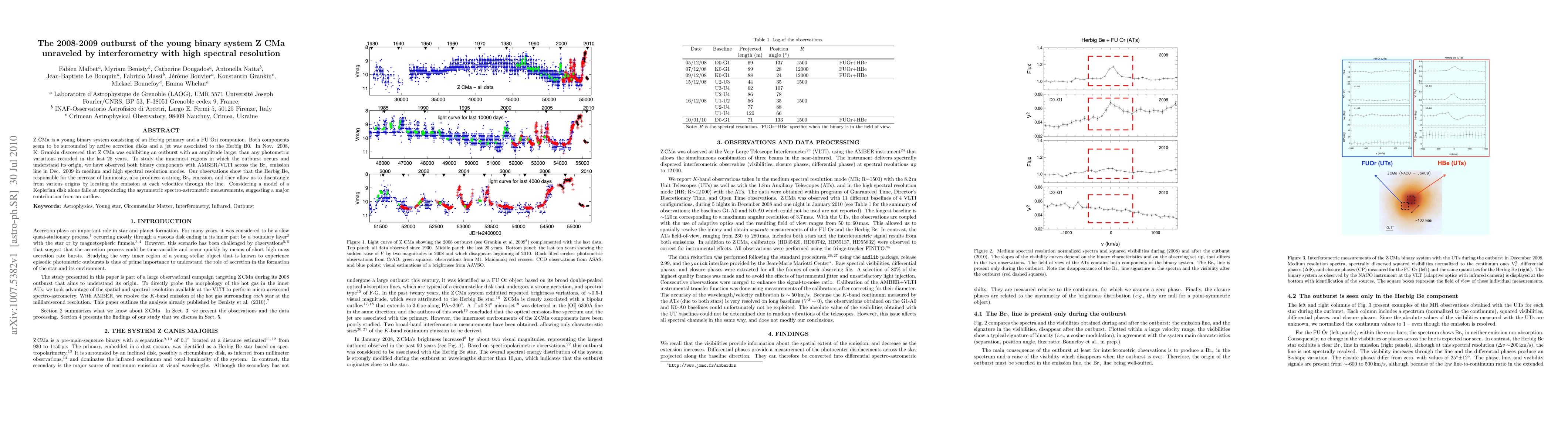This study uses interferometry to analyze the 2008-2009 outburst in the young binary system Z CMa, revealing that the Herbig Be component's luminosity increase is accompanied by strong Brγ emission. The observations suggest that an outflow significantly contributes to the system's dynamics, beyond what can be explained by a Keplerian disk alone.