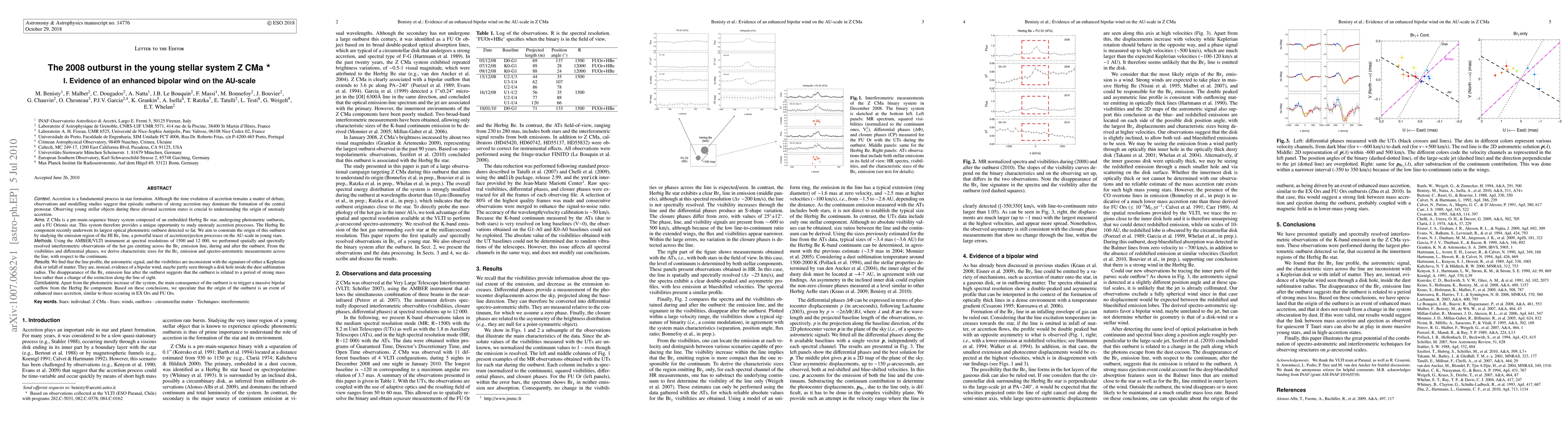 Accretion is a fundamental process in star formation. Although the time evolution of accretion remains a matter of debate, observations and modelling studies suggest that episodic outbursts of strong accretion may dominate the formation of the protostar. Observing young stellar objects during these elevated accretion states is crucial to understanding the origin of unsteady accretion. ZCMa is a pre-main-sequence binary system composed of an embedded Herbig Be star, undergoing photometric outbursts, and a FU Orionis star. The Herbig Be component recently underwent its largest optical photometric outburst detected so far. We aim to constrain the origin of this outburst by studying the emission region of the HI Brackett gamma line, a powerful tracer of accretion/ejection processes on the AU-scale in young stars. Using the AMBER/VLTI instrument at spectral resolutions of 1500 and 12 000, we performed spatially and spectrally resolved interferometric observations of the hot gas emitting across the Brackett gamma emission line, during and after the outburst. From the visibilities and differential phases, we derive characteristic sizes for the Brackett gamma emission and spectro-astrometric measurements across the line, with respect to the continuum. We find that the line profile, the astrometric signal, and the visibilities are inconsistent with the signature of either a Keplerian disk or infall of matter. They are, instead, evidence of a bipolar wind, maybe partly seen through a disk hole inside the dust sublimation radius. The disappearance of the Brackett gamma emission line after the outburst suggests that the outburst is related to a period of strong mass loss rather than a change of the extinction along the line of sight. Based on these conclusions, we speculate that the origin of the outburst is an event of enhanced mass accretion, similar to those occuring in EX Ors and FU Ors.
