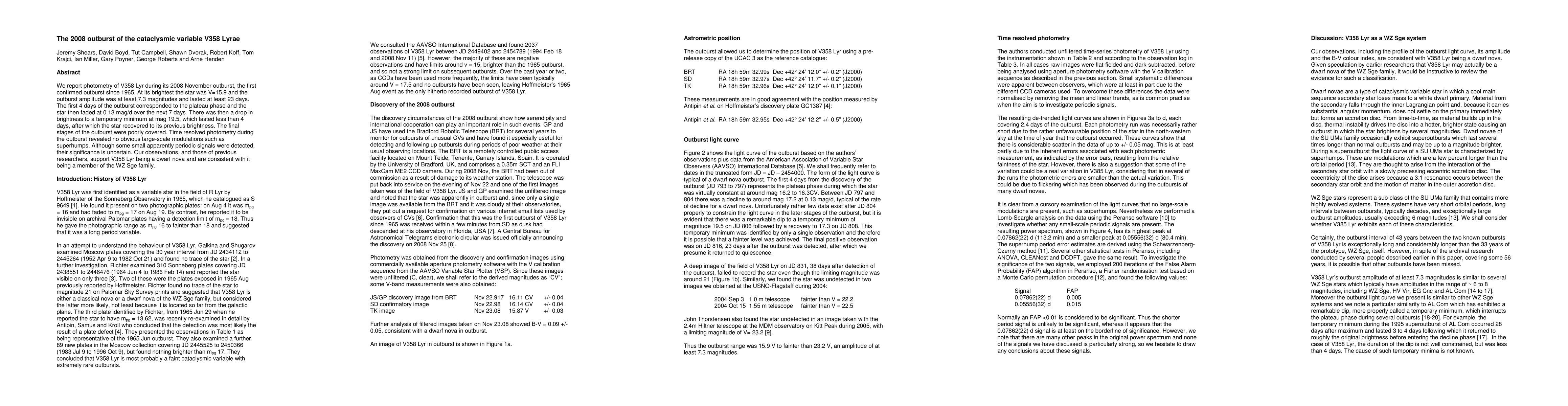 We report photometry of V358 Lyr during its 2008 November outburst, the first confirmed outburst since 1965. At its brightest the star was V=15.9 and the outburst amplitude was at least 7.3 magnitudes and lasted at least 23 days. The first 4 days of the outburst corresponded to the plateau phase and the star then faded at 0.13 mag/d over the next 7 days. There was then a drop in brightness to a temporary minimum at mag 19.5, which lasted less than 4 days, after which the star recovered to its previous brightness. The final stages of the outburst were poorly covered. Time resolved photometry during the outburst revealed no obvious large-scale modulations such as superhumps. Although some small apparently periodic signals were detected, their significance is uncertain. Our observations, and those of previous researchers, support V358 Lyr being a dwarf nova and are consistent with it being a member of the WZ Sge family.