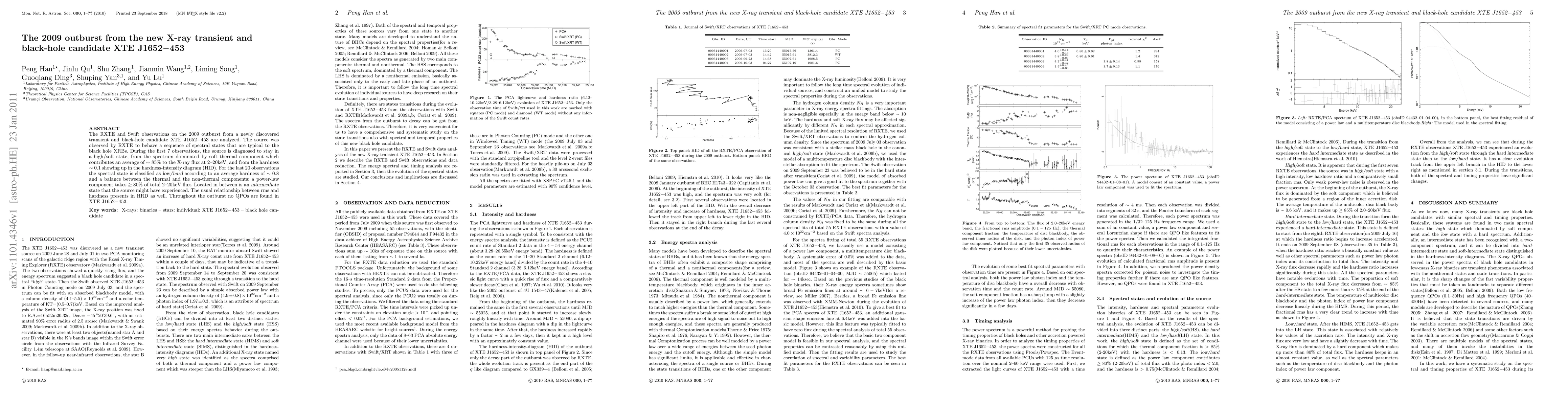 The RXTE and Swift observations on the 2009 outburst from a newly discovered transient and black-hole candidate XTE J1652$-$453 are analyzed. The source was observed by RXTE to behave a sequence of spectral states that are typical to the black hole XRBs. During the first 7 observations, the source is diagnosed to stay in a high/soft state, from the spectrum dominated by soft thermal component which contributes an average of $\sim$ 85% to the X-ray flux at 2-20keV, and from the hardness $\sim$ 0.1 showing up in the hardness-intensity diagram (HID). For the last 20 observations the spectral state is classified as {\sl low/hard} according to an average hardness of $\sim$ 0.8 and a balance between the thermal and the non-thermal components: a power-law component takes ${\geq}80%$ of total 2-20keV flux. Located in between is an {\sl intermediate} state that the source might have experienced. The usual relationship between rms and hardness presents in HRD as well. Throughout the outburst no QPOs are found in XTE J1652$-$453.