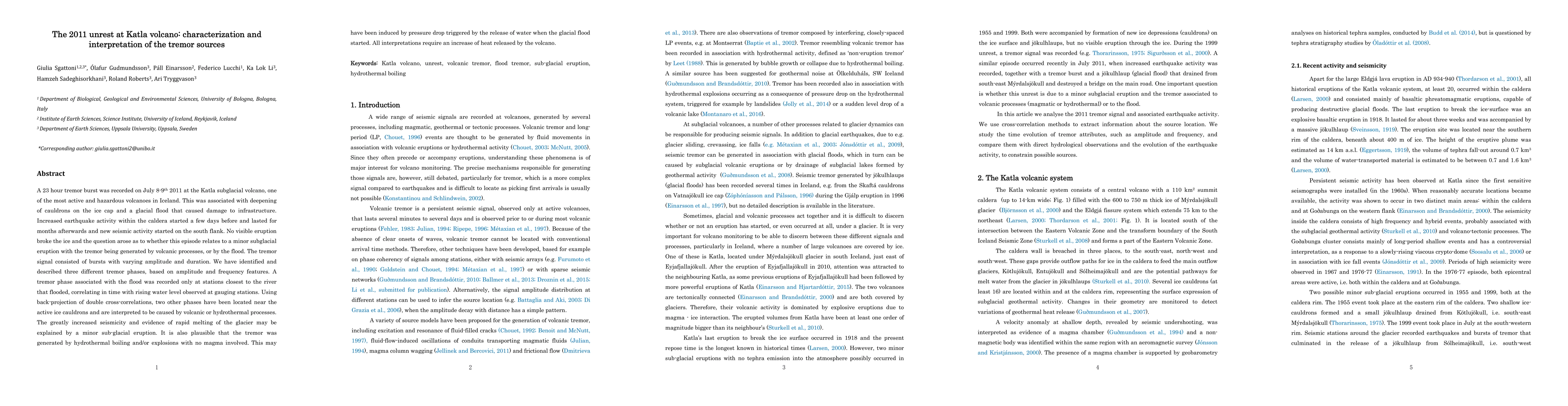 A 23-hour tremor burst at Katla volcano in 2011 was analyzed to determine its source, revealing three distinct phases linked to volcanic or hydrothermal processes, with evidence suggesting a minor subglacial eruption.