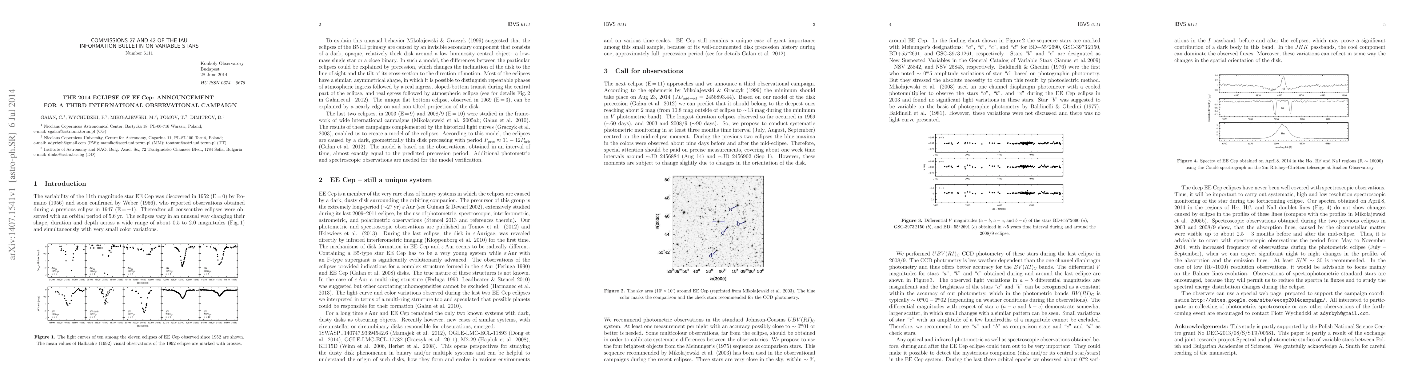 EE Cep is a unique system in which a Be star is eclipsed by a dark dusty disk, making this star similar to the famous epsilon Aur in many respects. The depth and the duration of the EE Cep eclipses change to a large extent. The last two eclipses were observed in the framework of extensive international campaigns. The joint analysis of these campaigns data and historical photometry, enabled us to propose a model of this system, which implies a disk precession with a period approximately 11-12 times larger than the orbital period. This model predicts that the forthcoming eclipse should be among the deepest observed, reaching about 2 mag. The next eclipse approaches - the photometric minimum should occur around August 23, 2014. Here we would like to announce a new, third international campaign with purpose to verify the disk precession model and to put more constraints on the physical parameters of this system.