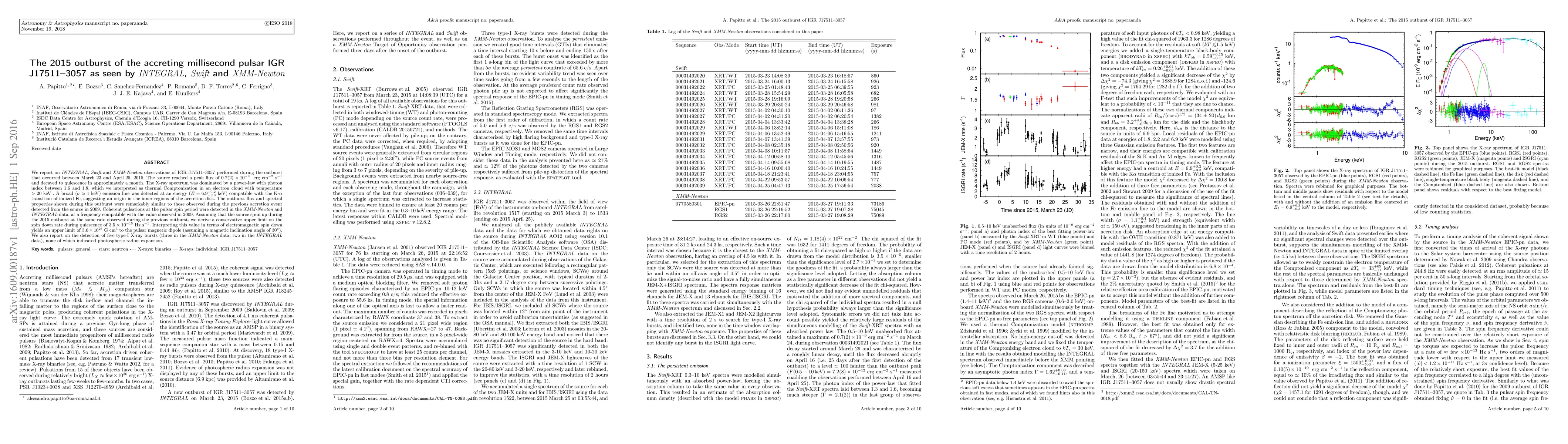 We report on INTEGRAL, Swift and XMM-Newton observations of IGR J17511-3057 performed during the outburst that occurred between March 23 and April 25, 2015. The source reached a peak flux of 0.7(2)E-9 erg/cm$^2$/s and decayed to quiescence in approximately a month. The X-ray spectrum was dominated by a power-law with photon index between 1.6 and 1.8, which we interpreted as thermal Comptonization in an electron cloud with temperature > 20 keV . A broad ({\sigma} ~ 1 keV) emission line was detected at an energy (E = 6.9$^{+0.2}_{-0.3}$ keV) compatible with the K{\alpha} transition of ionized Fe, suggesting an origin in the inner regions of the accretion disk. The outburst flux and spectral properties shown during this outburst were remarkably similar to those observed during the previous accretion event detected from the source in 2009. Coherent pulsations at the pulsar spin period were detected in the XMM-Newton and INTEGRAL data, at a frequency compatible with the value observed in 2009. Assuming that the source spun up during the 2015 outburst at the same rate observed during the previous outburst, we derive a conservative upper limit on the spin down rate during quiescence of 3.5E-15 Hz/s. Interpreting this value in terms of electromagnetic spin down yields an upper limit of 3.6E26 G/cm$^3$ to the pulsar magnetic dipole (assuming a magnetic inclination angle of 30{\deg}). We also report on the detection of five type-I X-ray bursts (three in the XMM-Newton data, two in the INTEGRAL data), none of which indicated photospheric radius expansion.