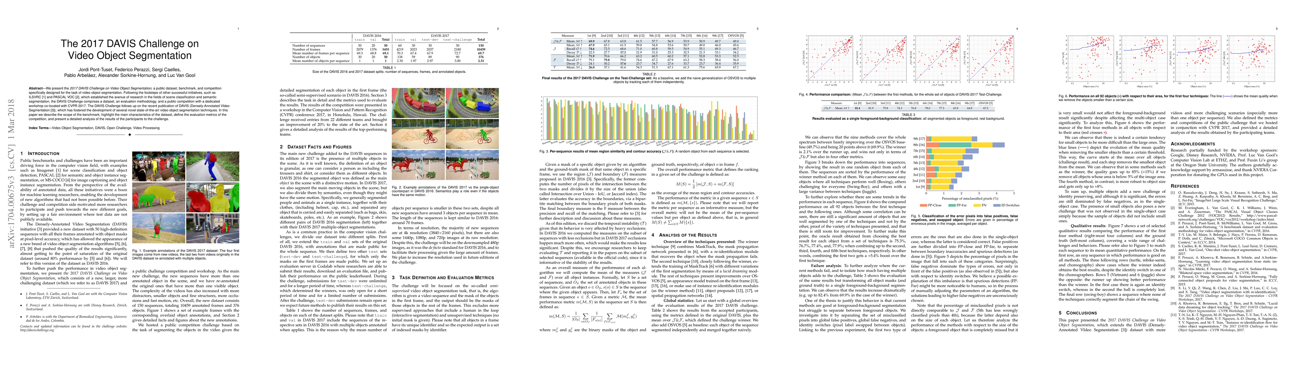 We present the 2017 DAVIS Challenge on Video Object Segmentation, a public dataset, benchmark, and competition specifically designed for the task of video object segmentation. Following the footsteps of other successful initiatives, such as ILSVRC and PASCAL VOC, which established the avenue of research in the fields of scene classification and semantic segmentation, the DAVIS Challenge comprises a dataset, an evaluation methodology, and a public competition with a dedicated workshop co-located with CVPR 2017. The DAVIS Challenge follows up on the recent publication of DAVIS (Densely-Annotated VIdeo Segmentation), which has fostered the development of several novel state-of-the-art video object segmentation techniques. In this paper we describe the scope of the benchmark, highlight the main characteristics of the dataset, define the evaluation metrics of the competition, and present a detailed analysis of the results of the participants to the challenge.