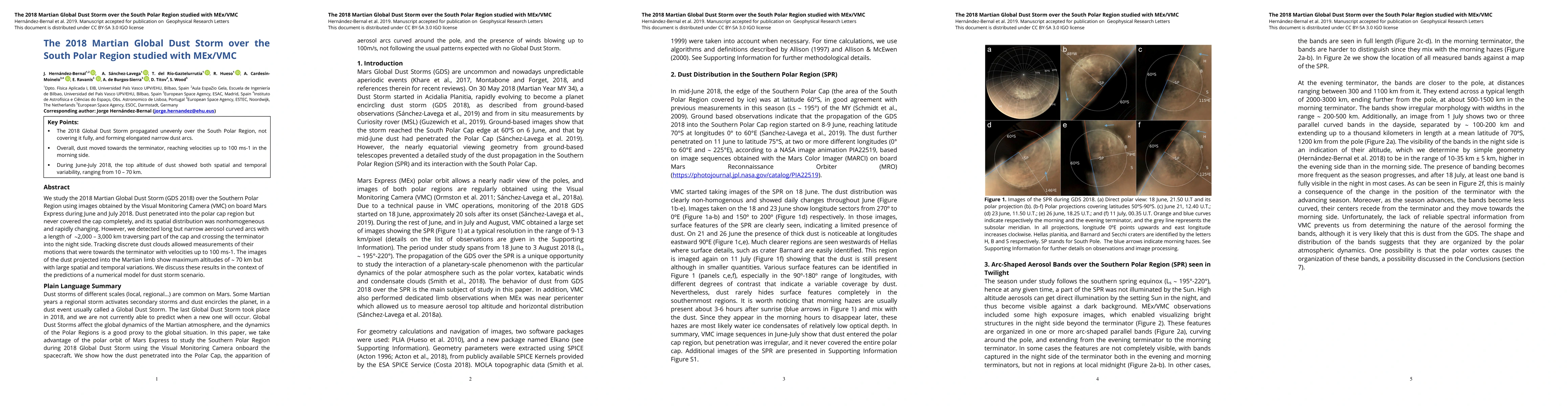 We study the 2018 Martian Global DustStorm (GDS 2018) over the Southern Polar Region using images obtained by the Visual Monitoring Camera (VMC) on board Mars Express during June and July 2018. Dust penetrated into the polar cap region but never covered the cap completely, and its spatial distribution was nonhomogeneous and rapidly changing. However, we detected long but narrow aerosol curved arcs with a length of 2,000-3,000 km traversing part of the cap and crossing the terminator into the night side. Tracking discrete dust clouds allowed measurements of their motions that were towards the terminator with velocities up to 100 m/s. The images of the dust projected into the Martian limb show maximum altitudes of around 70 km but with large spatial and temporal variations. We discuss these results in the context of the predictions of a numerical model for dust storm scenario.
