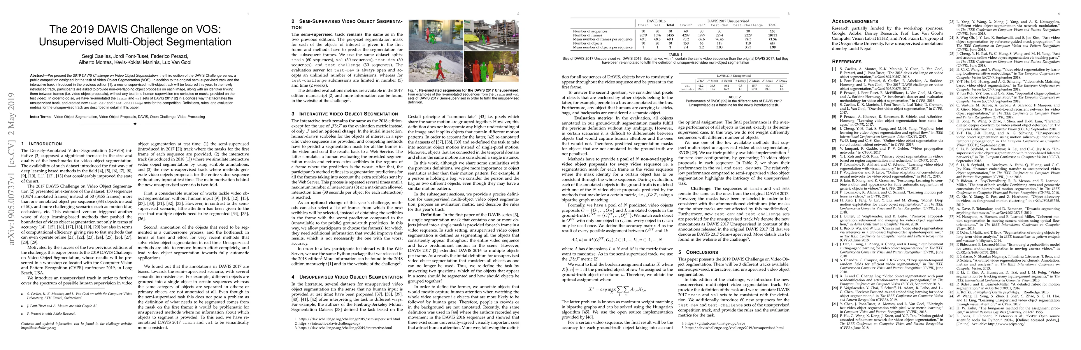 We present the 2019 DAVIS Challenge on Video Object Segmentation, the third edition of the DAVIS Challenge series, a public competition designed for the task of Video Object Segmentation (VOS). In addition to the original semi-supervised track and the interactive track introduced in the previous edition, a new unsupervised multi-object track will be featured this year. In the newly introduced track, participants are asked to provide non-overlapping object proposals on each image, along with an identifier linking them between frames (i.e. video object proposals), without any test-time human supervision (no scribbles or masks provided on the test video). In order to do so, we have re-annotated the train and val sets of DAVIS 2017 in a concise way that facilitates the unsupervised track, and created new test-dev and test-challenge sets for the competition. Definitions, rules, and evaluation metrics for the unsupervised track are described in detail in this paper.