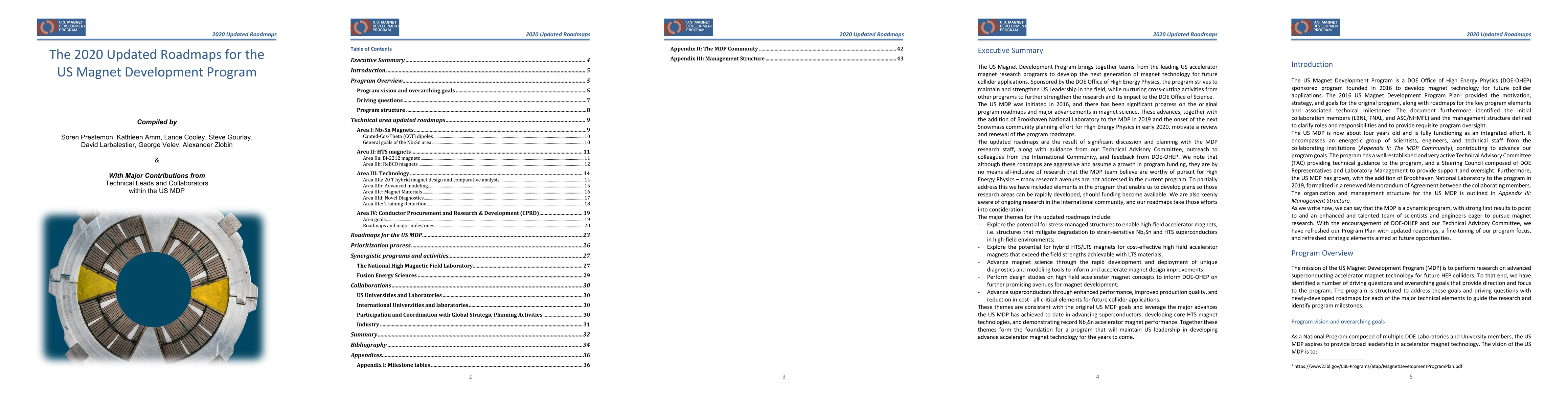The 2020 updated roadmaps for the US Magnet Development Program reflect significant advancements and new collaborations, aiming to maintain US leadership in next-generation magnet technology for future collider applications. The roadmaps incorporate feedback from the DOE Office of High Energy Physics and the international research community.