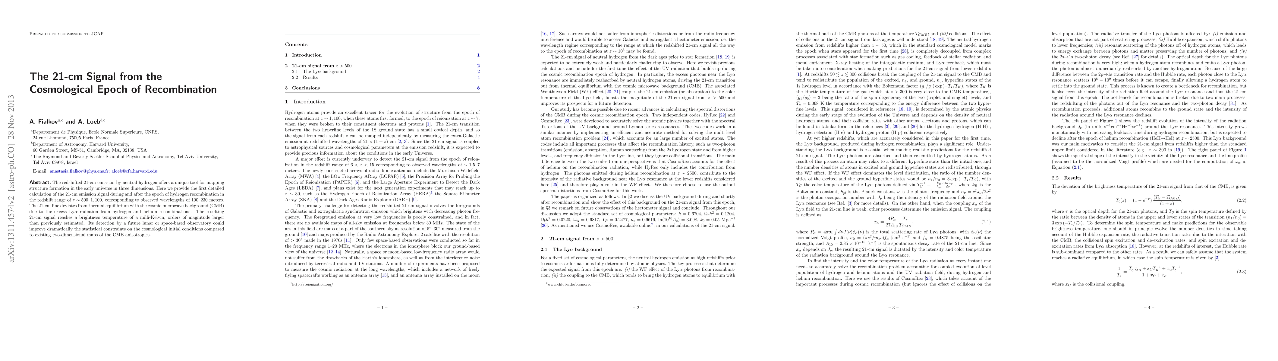 This paper provides a detailed calculation of the 21-cm emission signal from neutral hydrogen during and after the epoch of hydrogen recombination, revealing a brightness temperature orders of magnitude larger than previously estimated. The detection of this signal could significantly enhance our understanding of early universe structure formation.