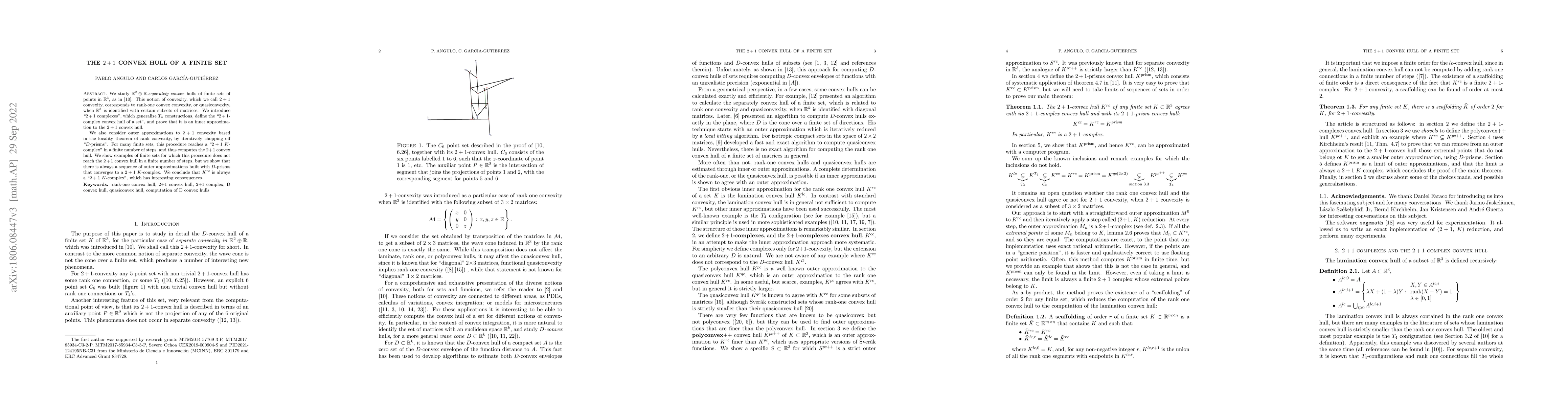 We study $\mathbb{R}^2\oplus\mathbb{R}$-separately convex hulls of finite sets of points in $\mathbb{R}^3$, as in KirchheimMullerSverak2003. This notion of convexity, which we call $2+1$ convexity, corresponds to rank-one convex convexity, or quasiconvexity, when $\mathbb{R}^3$ is identified with certain subsets of matrices. We introduce '$2+1$ complexes', which generalize $T_n$ constructions, define the '$2+1$-complex convex hull of a set', and prove that it is an inner approximation to the $2+1$ convex hull. We also consider outer approximations to $2+1$ convexity based in the locality theorem of rank convexity, by iteratively chopping off '$D$-prisms'. For many finite sets, this procedure reaches a '$2+1$ $K$-complex' in a finite number of steps, and thus computes the $2+1$ convex hull. We show examples of finite sets for which this procedure does not reach the $2+1$ convex hull in a finite number of steps, but we show that there is always a sequence of outer approximations built with $D$-prisms that converges to a $2+1$ $K$-complex. We conclude that $K^{rc}$ is always a '$2+1$ $K$-complex', which has interesting consequences.