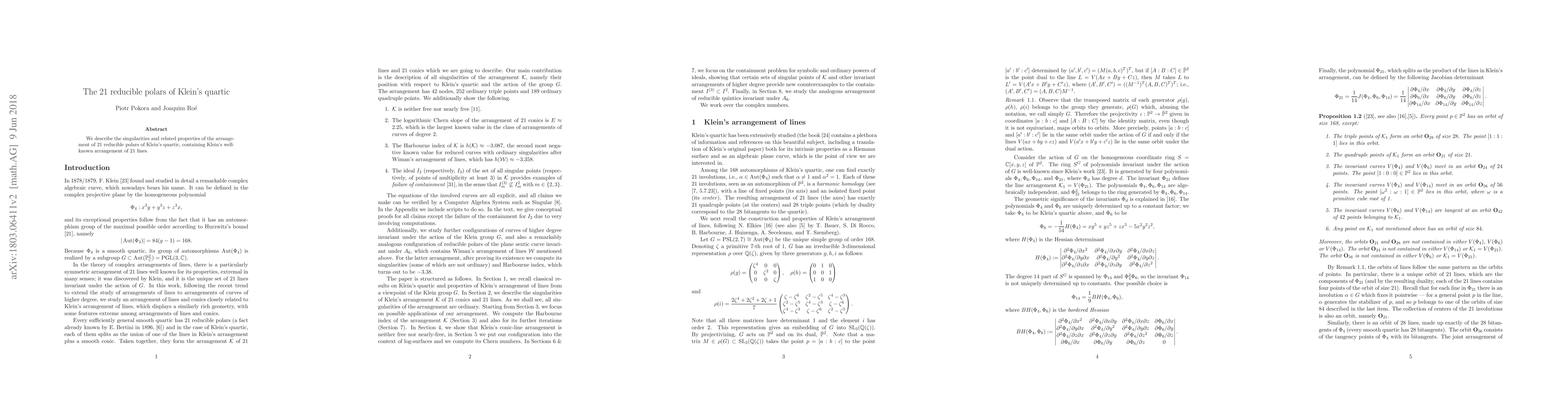Summary: This paper explores the singularities and properties of the arrangement of 21 reducible polars associated with Klein's quartic, emphasizing their relationship to the famous configuration of 21 lines in the context of algebraic geometry.