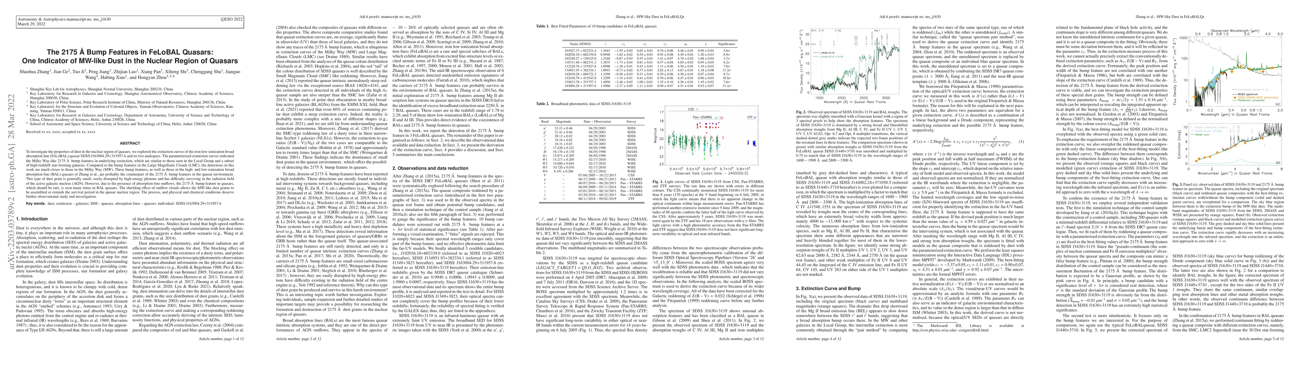 To investigate the properties of dust in the nuclear region of quasars, we explored the extinction curves of the iron low-ionization broad absorption line (FeLoBAL) quasar SDSS J163004.29+311957.6 and its two analogues. The parameterized extinction curves indicated the Milky Way-like 2175 \AA~ bump features in underlying extinction, which are similar to those seen in the Local Group and a subset of high-redshift star-forming galaxies. Compared to the bump features in the Large Magellanic Clouds (LMC), the detections in this work are much closer to those in the Milky Way (MW). These bump features, as well as those in the high- and low-ionization broad absorption line (BAL) quasars of Zhang et al., are probably the counterpart of the 2175 \AA~ bump features in the quasar environment. This type of dust grain is generally small, easily disrupted by high-energy photons and has difficulty surviving in the radiation field of the active galactic nucleus (AGN). However, due to the presence of absorption-line outflows, the 2175 \AA~ bump feature in quasars, which should be rare, is seen many times in BAL quasars. The shielding effect of outflow clouds allows the MW-like dust grains to be assembled or extends the survival period in the quasar nuclear region. The process, and physical and chemical conditions deserve further observational study and investigation.