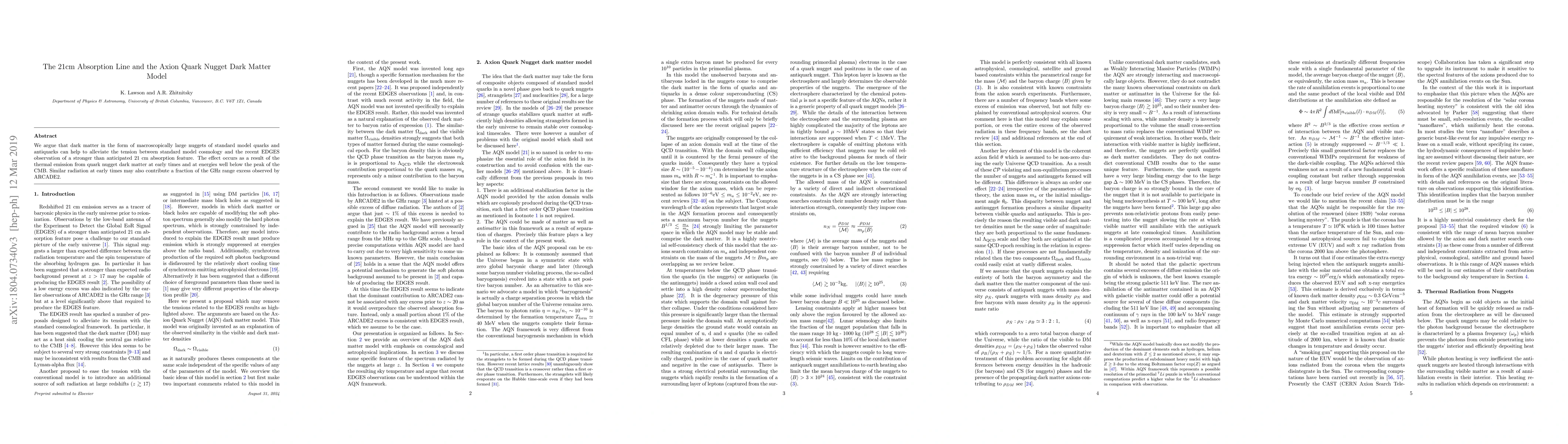 We argue that dark matter in the form of macroscopically large nuggets of standard model quarks and antiquarks can help to alleviate the tension between standard model cosmology and the recent EDGES observation of a stronger than anticipated 21 cm absorption feature. The effect occurs as a result of the thermal emission from quark nugget dark matter at early times and at energies well below the peak of the CMB. Similar radiation at early times may also contribute a fraction of the GHz range excess observed by ARCADE2.