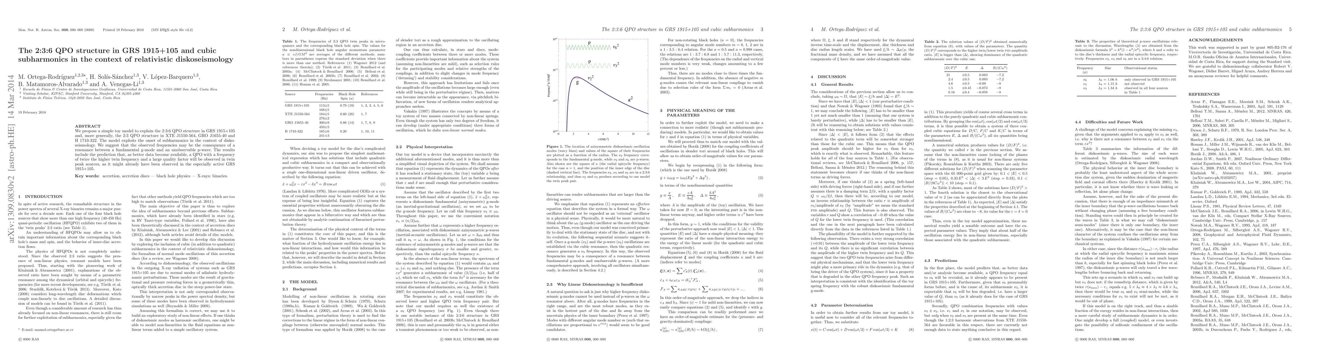 We propose a simple toy model to explain the 2:3:6 QPO structure in GRS 1915+105 and, more generally, the 2:3 QPO structure in XTE J1550-564, GRO J1655-40, and H 1743-322. The model exploits the onset of subharmonics in the context of diskoseismology. We suggest that the observed frequencies may be the consequence of a resonance between a fundamental g-mode and an unobservable p-wave. The results include the prediction that, as better data become available, a QPO with a frequency of twice the higher twin frequency and a large quality factor will be observed in twin peak sources, as it might already have been observed in the especially active GRS 1915+105.
