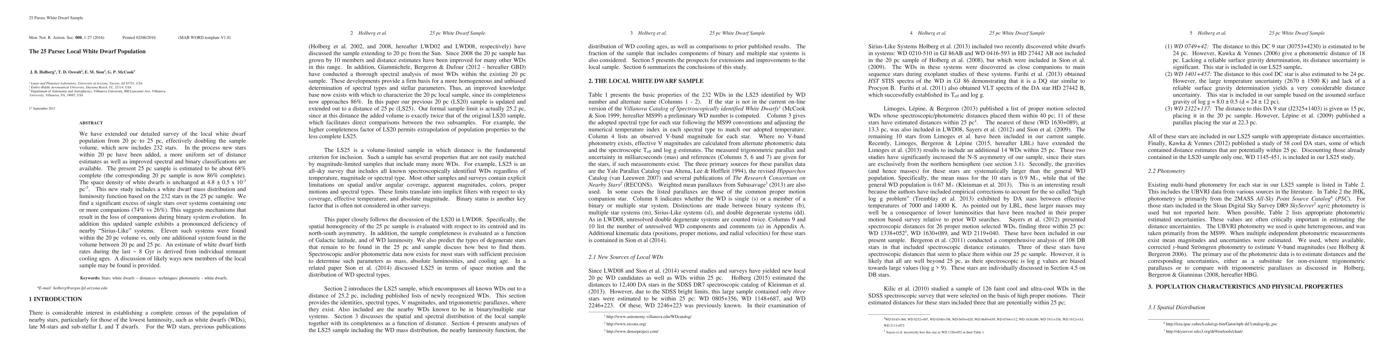 This study expands the local white dwarf survey to 25 parsecs, doubling the sample volume and including 232 stars, with an estimated 68% completeness. The space density remains at 4.8 ± 0.5 x 10^-3 pc^-3, and it reveals a significant excess of single white dwarfs, suggesting companion loss during binary evolution.