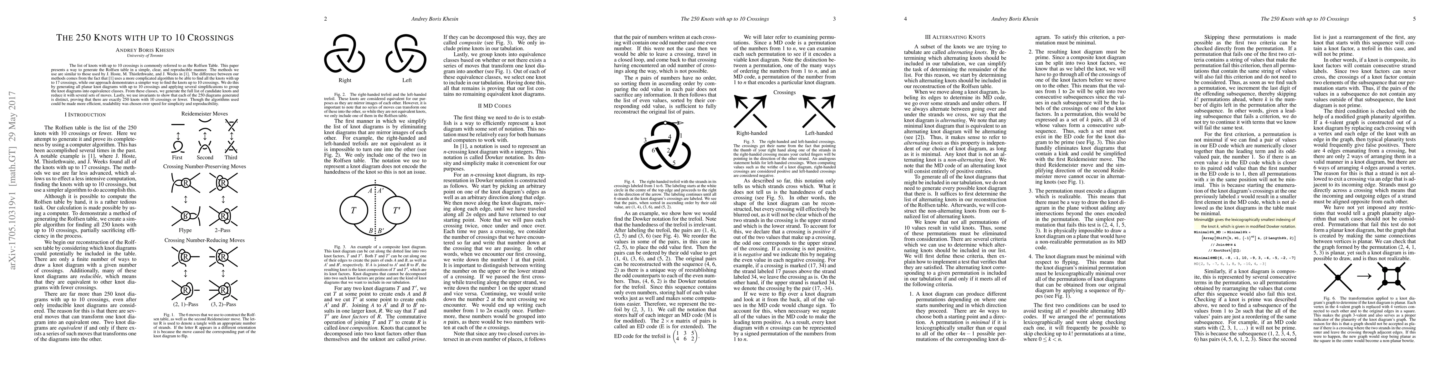 The list of knots with up to 10 crossings is commonly referred to as the Rolfsen Table. This paper presents a way to generate the Rolfsen table in a simple, clear, and reproducible manner. The methods we use are similar to those used by J. Hoste, M. Thistlethwaite, and J. Weeks in [1]. The difference between our methods comes from the fact that [1] uses a more complicated algorithm to be able to find all the knots with up to 17 crossings, while our approach demonstrates a simpler way to find the knots up to 10 crossings. We do this by generating all planar knot diagrams with up to 10 crossings and applying several simplifications to group the knot diagrams into equivalence classes. From these classes, we generate the full list of candidate knots and reduce it with several sets of moves. Lastly, we use invariants to show that each of the 250 diagrams generated is distinct, proving that there are exactly 250 knots with 10 crossings or fewer. Though the algorithms used could be made more efficient, readability was chosen over speed for simplicity and reproducibility.