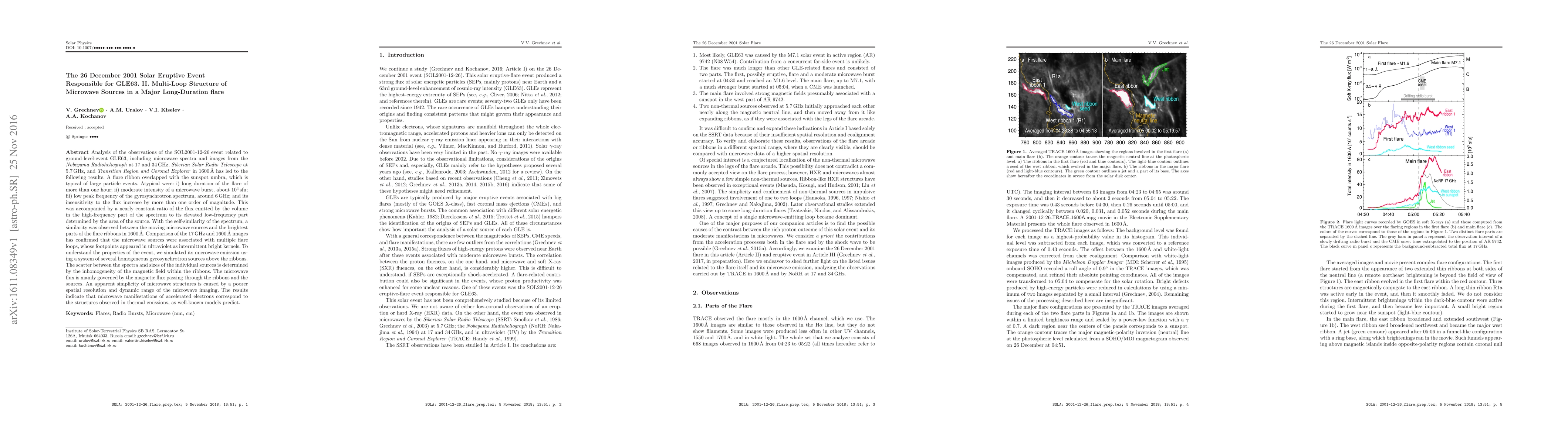 Analysis of the observations of the SOL2001-12-26 event related to ground-level-event GLE63, including microwave spectra and images from NoRH at 17 and 34 GHz, SSRT at 5.7 GHz, and TRACE in 1600 \AA\ has led to the following results. A flare ribbon overlapped with the sunspot umbra, which is typical of large particle events. Atypical were: i) long duration of the flare of more than one hour; ii) moderate intensity of a microwave burst, about $10^4$ sfu; iii) low peak frequency of the gyrosynchrotron spectrum, around 6 GHz; and its insensitivity to the flux increase by more than one order of magnitude. This was accompanied by a nearly constant ratio of the flux emitted by the volume in the high-frequency part of the spectrum to its elevated low-frequency part determined by the area of the source. With the self-similarity of the spectrum, a similarity was observed between the moving microwave sources and the brightest parts of the flare ribbons in 1600 \AA. Comparison of the 17 GHz and 1600 \AA\ images has confirmed that the microwave sources were associated with multiple flare loops, whose footpoints appeared in ultraviolet as intermittent bright kernels. To understand the properties of the event, we simulated its microwave emission using a system of several homogeneous gyrosynchrotron sources above the ribbons. The scatter between the spectra and sizes of the individual sources is determined by the inhomogeneity of the magnetic field within the ribbons. The microwave flux is mainly governed by the magnetic flux passing through the ribbons and the sources. An apparent simplicity of microwave structures is caused by a poorer spatial resolution and dynamic range of the microwave imaging. The results indicate that microwave manifestations of accelerated electrons correspond to the structures observed in thermal emissions, as well-known models predict.