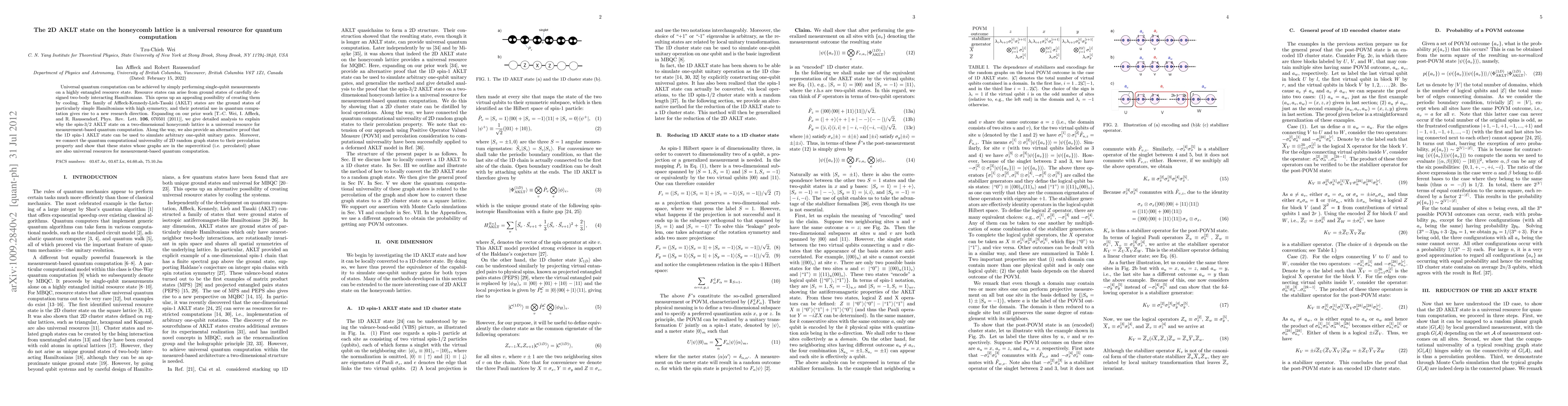 The paper demonstrates that the spin-3/2 AKLT state on a two-dimensional honeycomb lattice serves as a universal resource for measurement-based quantum computation, extending prior work and providing an alternative proof for the 1D spin-1 AKLT state's utility in simulating one-qubit gates. It also links the universality of 2D random graph states to their percolation properties.