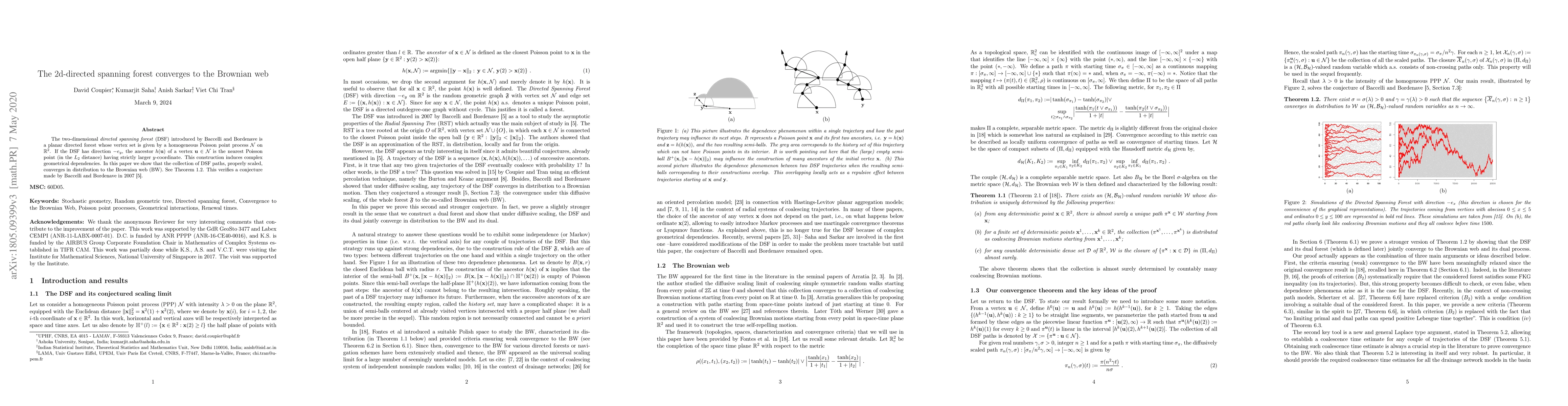 This paper demonstrates that the two-dimensional directed spanning forest (DSF) converges to the Brownian web (BW) when properly scaled, verifying a 2007 conjecture by Baccelli and Bordenave. The DSF is a planar directed forest derived from a homogeneous Poisson point process with specific ancestor rules based on $y$-coordinates.