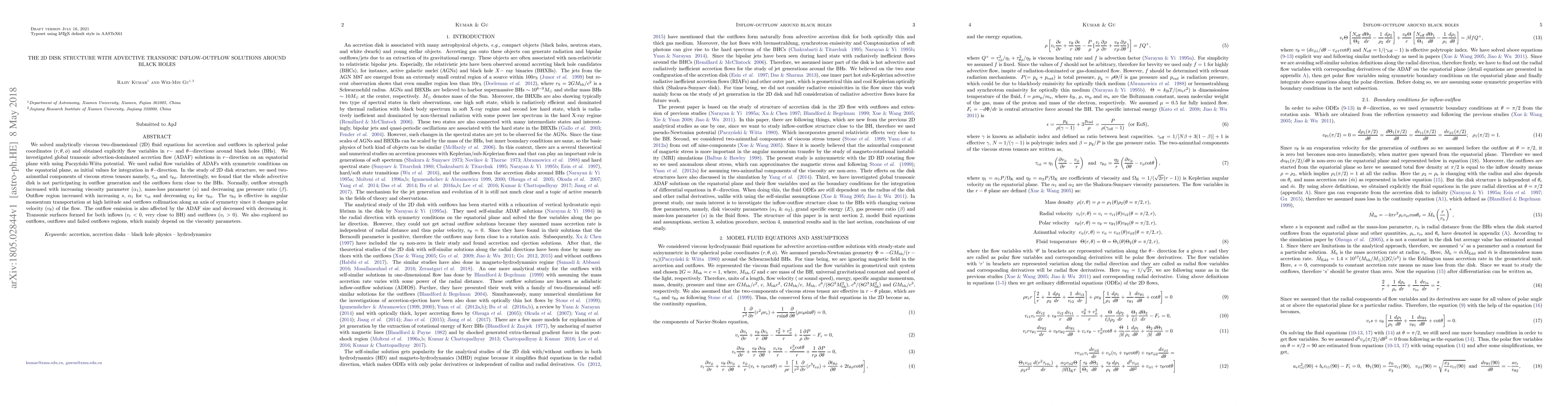 We solved analytically viscous two-dimensional (2D) fluid equations for accretion and outflows in spherical polar coordinates ($r, \theta, \phi$) and obtained explicitly flow variables in $r-$ and $\theta -$directions around black holes (BHs). We investigated global transonic advection-dominated accretion flow (ADAF) solutions in $r-$direction on an equatorial plane with using Paczy\'nski-Wiita potential. We used radial flow variables of ADAFs with symmetric conditions on the equatorial plane, as initial values for integration in $\theta-$direction. In the study of 2D disk structure, we used two-azimuthal components of viscous stress tensors namely, $\tau_{\rm r\phi}$ and $\tau_{\rm\theta\phi}$. Interestingly, we found that the whole advective disk is not participating in outflow generation and the outflows form close to the BHs. Normally, outflow strength increased with increasing viscosity parameter ($\alpha_1$), mass-loss parameter ($s$) and decreasing gas pressure ratio ($\beta$). Outflow region increased with increasing $s$, $\alpha_1$ for $\tau_{\rm r\phi}$ and decreasing $\alpha_2$ for $\tau_{\rm\theta\phi}$. The $\tau_{\rm\theta\phi}$ is effective in angular momentum transportation at high latitude and outflows collimation along an axis of symmetry since it changes polar velocity ($v_{\rm\theta}$) of the flow. The outflow emission is also affected by the ADAF size and decreased with decreasing it. Transonic surfaces formed for both inflows ($v_{\rm r}<0$, very close to BH) and outflows ($v_{\rm r}>0$). We also explored no outflows, outflows and failed outflows regions, which mainly depend on the viscosity parameters.