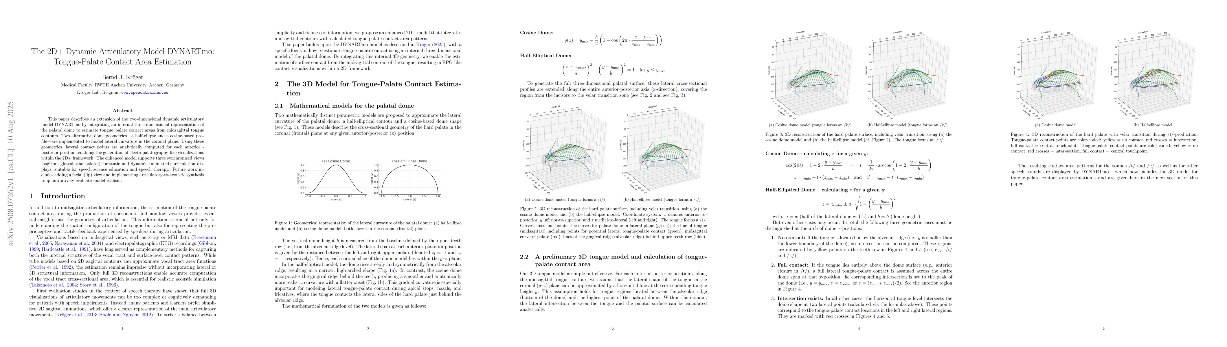 The paper introduces an extended 2D+ dynamic articulatory model, DYNARTmo, with an integrated 3D palatal dome representation for estimating tongue-palate contact areas, providing synchronized views for articulation displays.