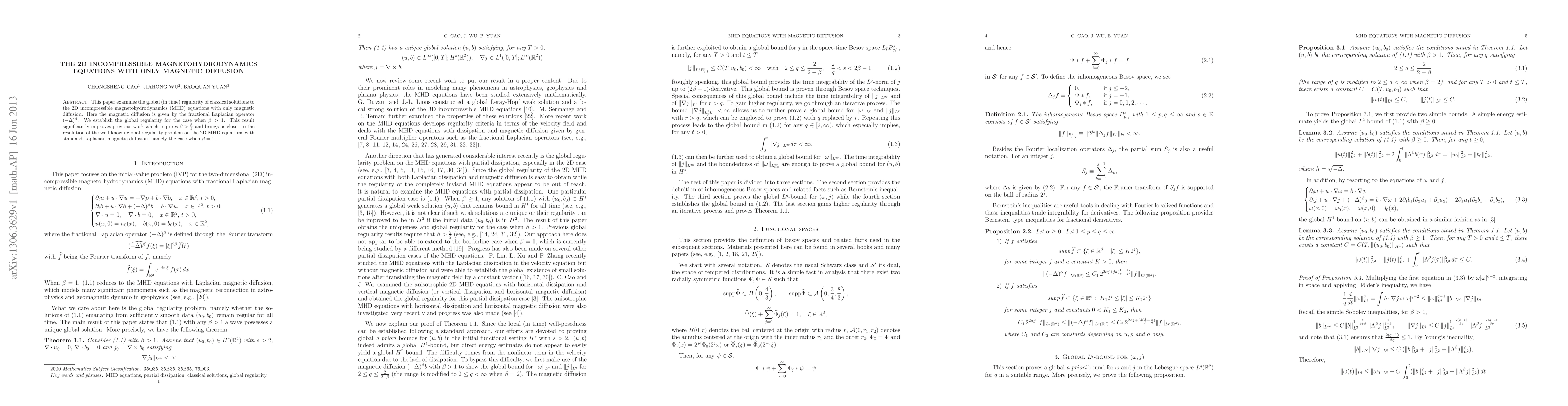 The paper examines global (in time) regularity of classical solutions to the 2D incompressible magnetohydrodynamics (MHD) equations with only magnetic diffusion, utilizing the fractional Laplacian operator (-\Delta)^\beta and establishing global regularity for \(\beta > 1\).