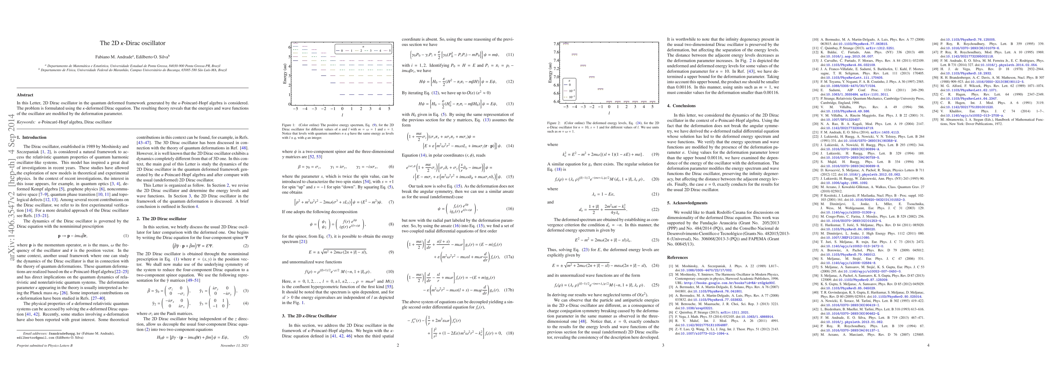 The paper derives the κ-deformed radial differential equation for the 2D Dirac oscillator, leading to the deformed energy spectrum and wave functions.