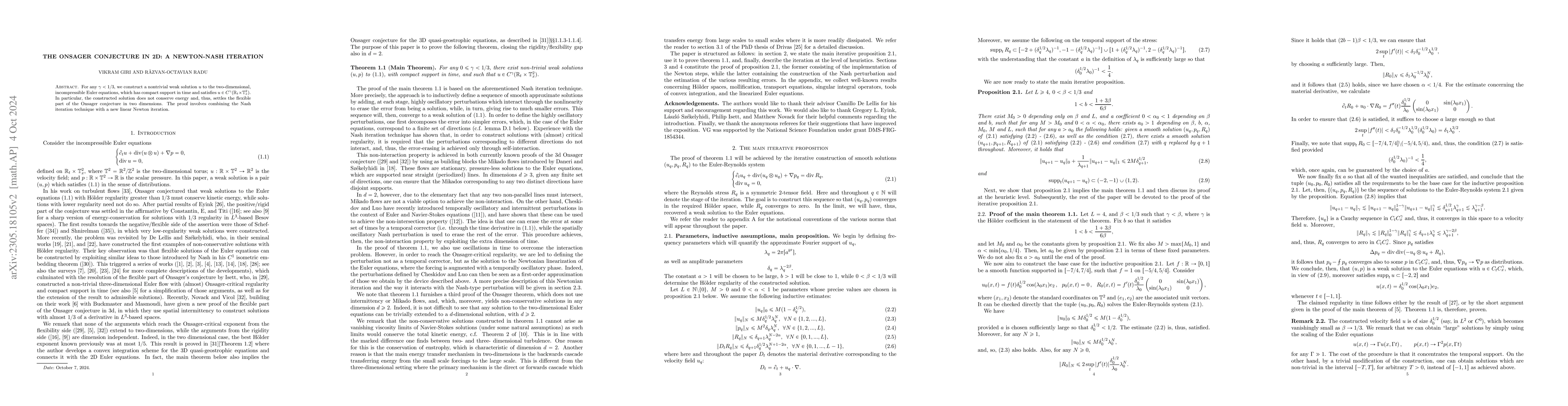 For any $\gamma<1/3$, we construct a nontrivial weak solution $u$ to the two-dimensional, incompressible Euler equations, which has compact support in time and satisfies $u\in C^\gamma(\mathbb R_t \times \mathbb T^2_x)$. In particular, the constructed solution does not conserve energy and, thus, settles the flexible part of the Onsager conjecture in two dimensions. The proof involves combining the Nash iteration technique with a new linear Newton iteration.