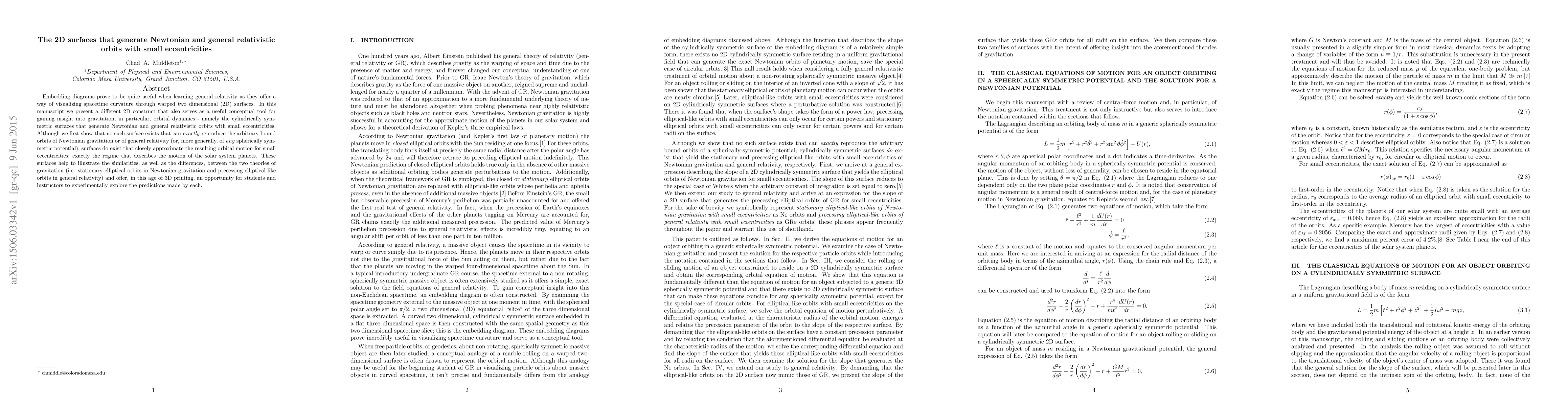 This paper introduces cylindrically symmetric 2D surfaces that approximate Newtonian and general relativistic orbits with small eccentricities, providing a visual tool for understanding gravitational dynamics and offering a hands-on approach for exploring these theories through 3D printing.