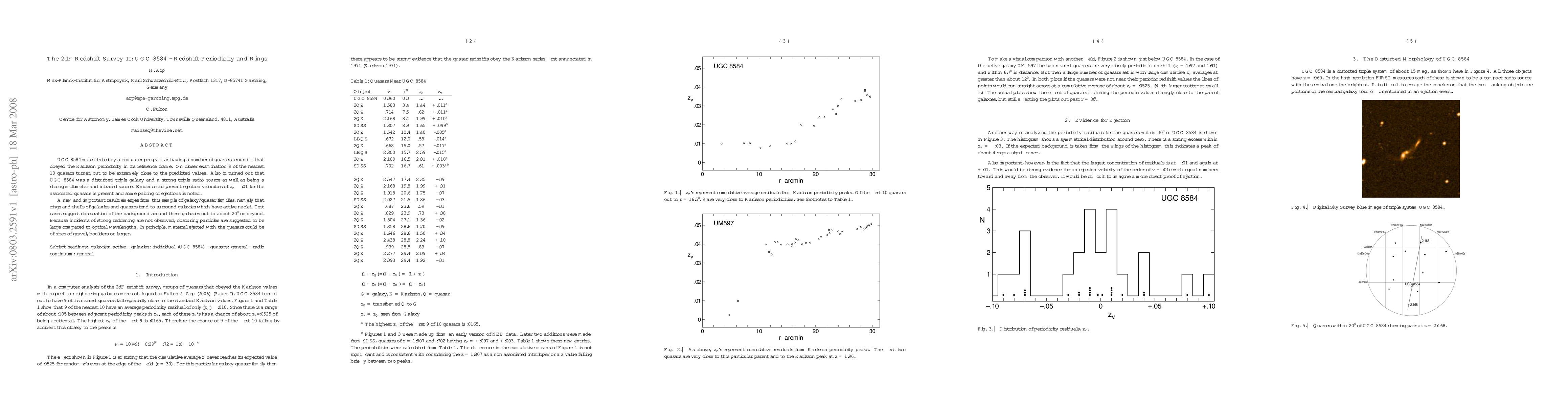 UGC 8584 was selected by a computer program as having a number of quasars around it that obeyed the Karlsson periodicity in its reference frame. On closer examination 9 of the nearest 10 quasars turned out to be extremely close to the predicted values. Also it turned out that UGC 8584 was a disturbed triple galaxy and a strong triple radio source as well as being a strong millimeter and infrared source. Evidence for present ejection velocities of $z_v \sim .01$ for the associated quasars is present and some pairing of ejections is noted. A new and important result emerges from this sample of galaxy/quasar families, namely that rings and shells of galaxies and quasars tend to surround galaxies which have active nuclei. Test cases suggest obscuration of the background around these galaxies out to about 20' or beyond. Because incidents of strong reddening are not observed, obscuring particles are suggested to be large compared to optical wavelengths. In principle, material ejected with the quasars could be of sizes of gravel or larger.