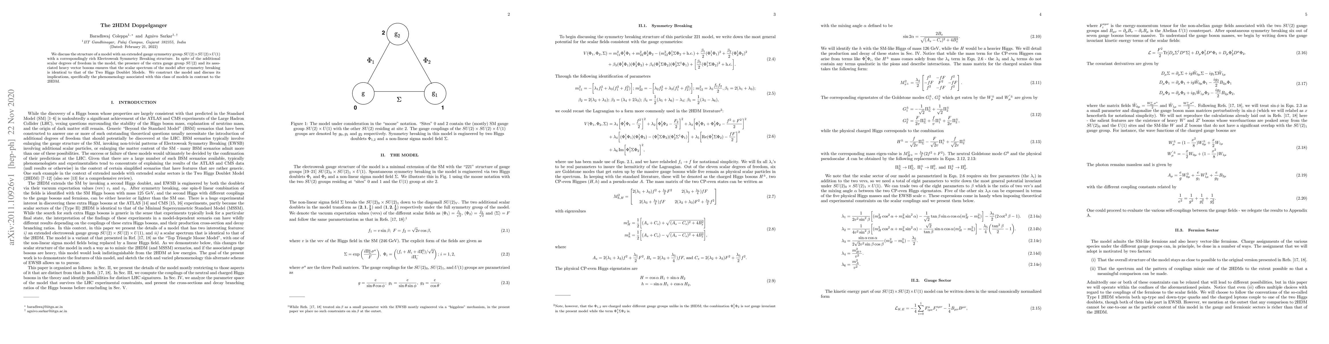 We discuss the structure of a model with an extended gauge symmetry group $SU(2)\times SU(2)\times U(1)$ with a correspondingly rich Electroweak Symmetry Breaking structure. In spite of the additional scalar degrees of freedom in the model, the presence of the extra gauge group $SU(2)$ and its associated heavy vector bosons ensures that the scalar spectrum of the model after symmetry breaking is identical to that of the Two Higgs Doublet Models. We construct the model and discuss its implications, specifically the phenomenology associated with this class of models in contrast to the 2HDM.