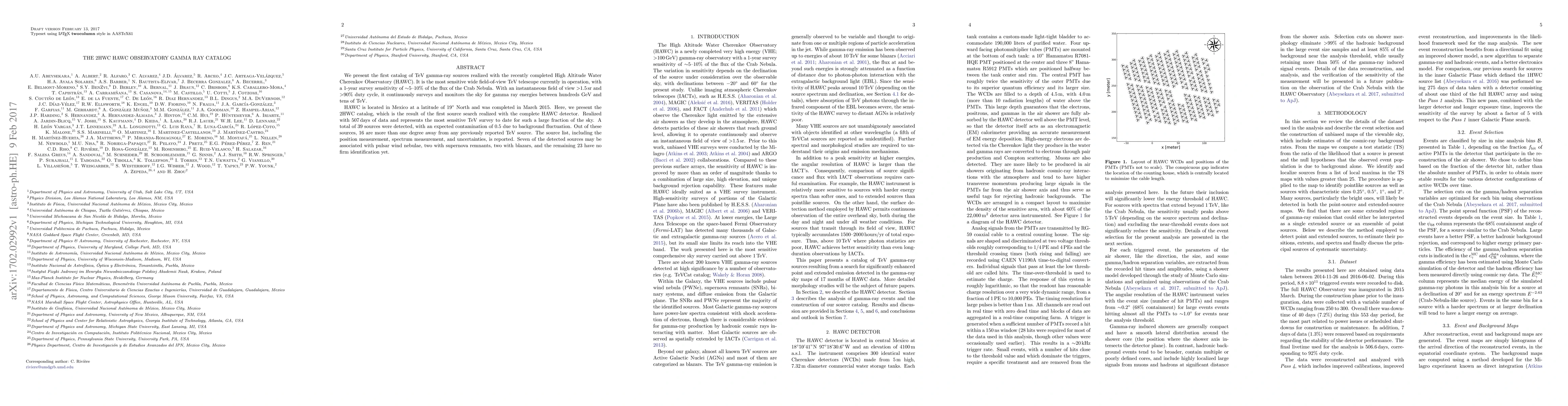 The High Altitude Water Cherenkov Observatory (HAWC) has released its first TeV gamma-ray catalog, detecting 39 sources with minimal background contamination. Notable associations include potential links to pulsar wind nebulae, supernova remnants, and blazars, while 23 sources remain unidentified.
