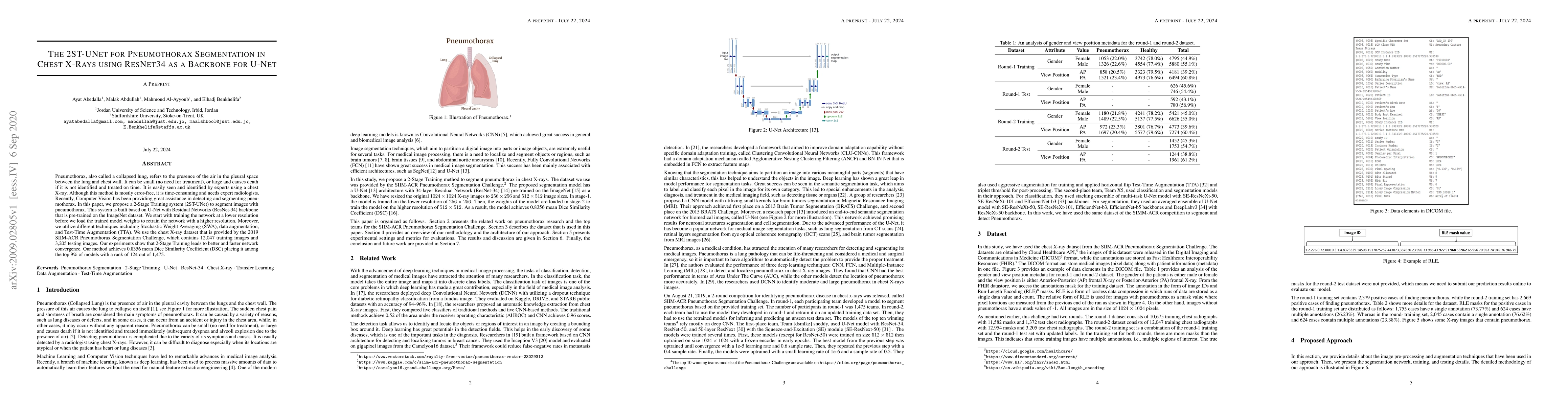 This paper proposes a 2-Stage Training (2ST-UNet) system using a ResNet34 backbone for segmenting pneumothorax in chest X-rays. The method employs a lower resolution training followed by higher resolution retraining, along with Stochastic Weight Averaging and data augmentation. The model ranks 124 out of 1,475 with a mean Dice Similarity Coefficient of 0.8356.