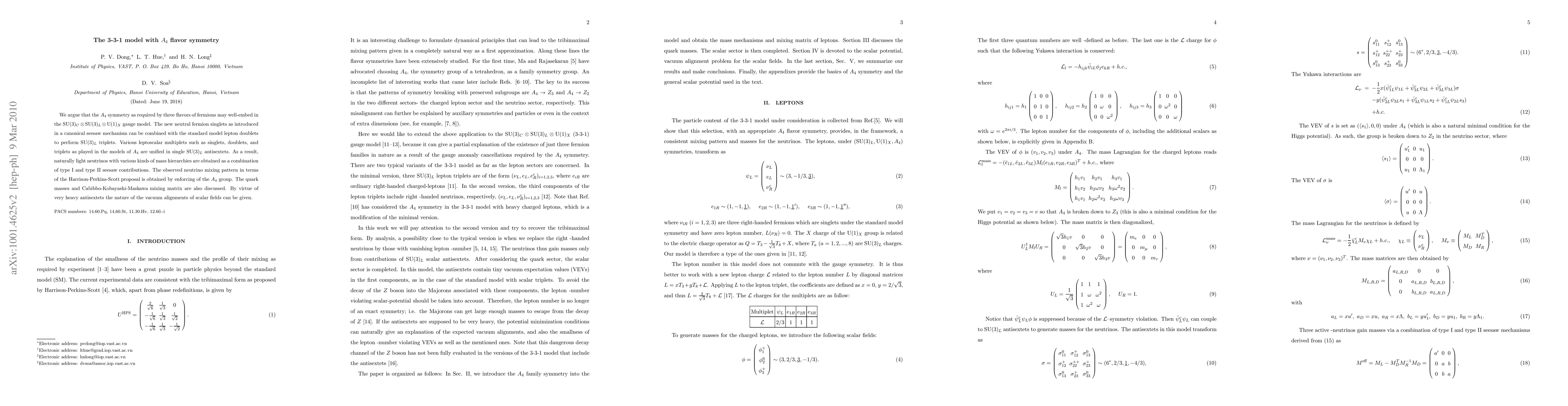 We argue that the A_4 symmetry as required by three flavors of fermions may well-embed in the SU(3)_C X SU(3)_L X U(1)_X gauge model. The new neutral fermion singlets as introduced in a canonical seesaw mechanism can be combined with the standard model lepton doublets to perform SU(3)_L triplets. Various leptoscalar multiplets such as singlets, doublets, and triplets as played in the models of A_4 are unified in single SU(3)_L antisextets. As a result, naturally light neutrinos with various kinds of mass hierarchies are obtained as a combination of type I and type II seesaw contributions. The observed neutrino mixing pattern in terms of the Harrison-Perkins-Scott proposal is obtained by enforcing of the A_4 group. The quark masses and Cabibbo-Kobayashi-Maskawa mixing matrix are also discussed. By virtue of very heavy antisextets the nature of the vacuum alignments of scalar fields can be given.