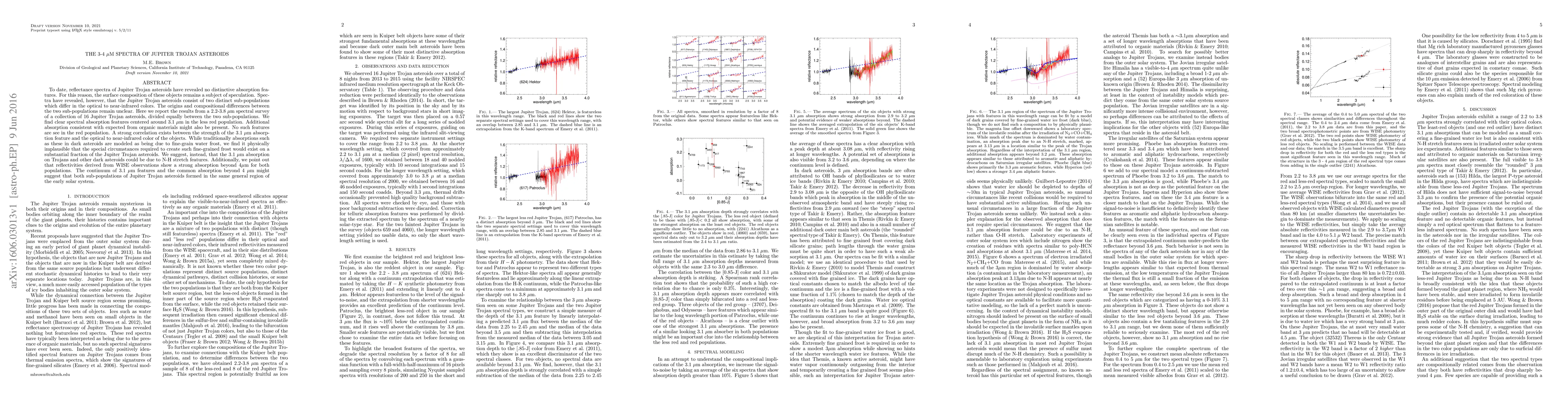 Researchers analyzed spectra of Jupiter Trojan asteroids, finding distinct absorption features centered at 3.1 $π$m in one sub-population, suggesting a possible origin from organic materials or N-H stretch features.