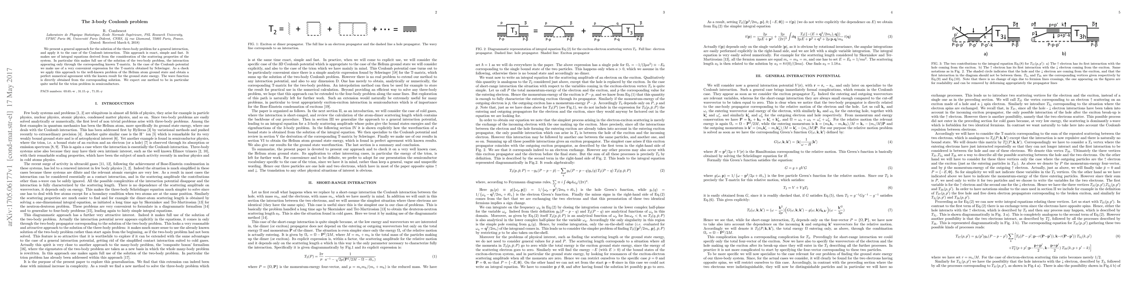 We present a general approach for the solution of the three-body problem for a general interaction, and apply it to the case of the Coulomb interaction. This approach is exact, simple and fast. It makes use of integral equations derived from the consideration of the scattering properties of the system. In particular this makes full use of the solution of the two-body problem, the interaction appearing only through the corresponding known T-matrix. In the case of the Coulomb potential we make use of a very convenient expression for the T-matrix obtained by Schwinger. As a check we apply this approach to the well-known problem of the Helium atom ground state and obtain a perfect numerical agreement with the known result for the ground state energy. The wave function is directly obtained from the corresponding solution. We expect our method to be in particular quite useful for the trion problem in semiconductors.