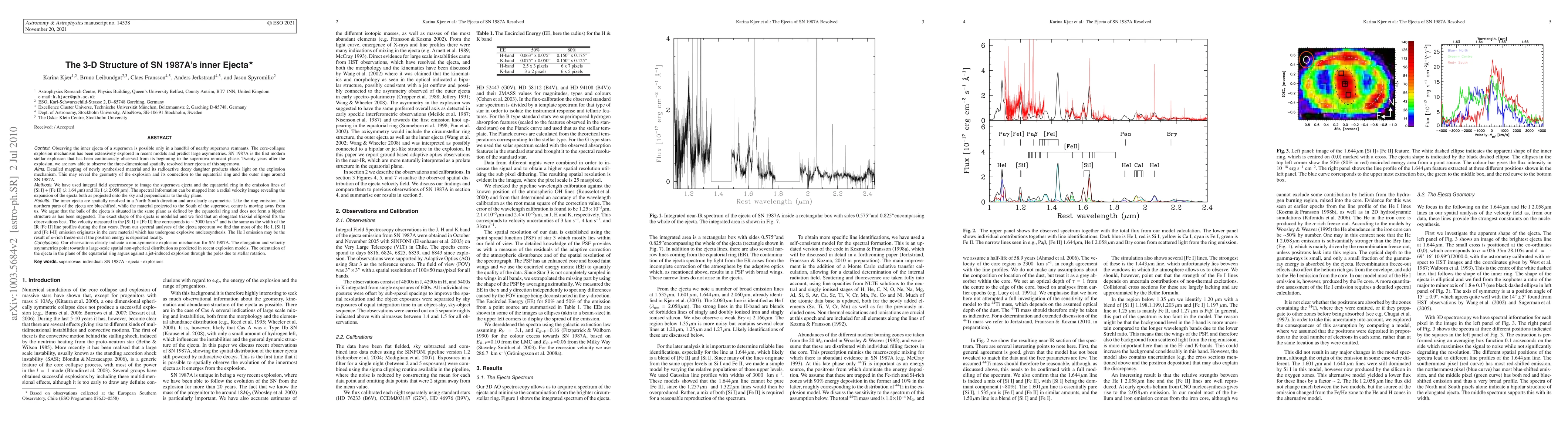 Twenty years after the explosion of SN 1987A, we are now able to observe the three-dimensional spatially resolved inner ejecta. Detailed mapping of newly synthesised material and its radioactive decay daughter products sheds light on the explosion mechanism. This may reveal the geometry of the explosion and its connection to the equatorial ring and the outer rings around SN 1987A. We have used integral field spectroscopy to image the supernova ejecta and the equatorial ring in the emission lines of [Si I]+[Fe II] and He I. The spectral information can be mapped into a radial velocity image revealing the expansion of the ejecta both as projected onto the sky and perpendicular to the sky plane. The inner ejecta are spatially resolved in a North-South direction and are clearly asymmetric. We argue that the bulk of the ejecta is situated in the same plane as defined by the equatorial ring and does not form a bipolar structure as has been suggested. The exact shape of the ejecta is modelled and we find that an elongated triaxial ellipsoid fits the observations best. From our spectral analyses of the ejecta spectrum we find that most of the He I, [Si I] and [Fe I-II] emission originates in the core material which has undergone explosive nucleosynthesis. The He I emission may be the result of alpha-rich freeze-out if the positron energy is deposited locally. Our observations clearly indicate a non-symmetric explosion mechanism for SN 1987A. The elongation and velocity asymmetries point towards a large-scale spatial non-spherical distribution as predicted in recent explosion models. The orientation of the ejecta in the plane of the equatorial ring argues against a jet-induced explosion through the poles due to stellar rotation.