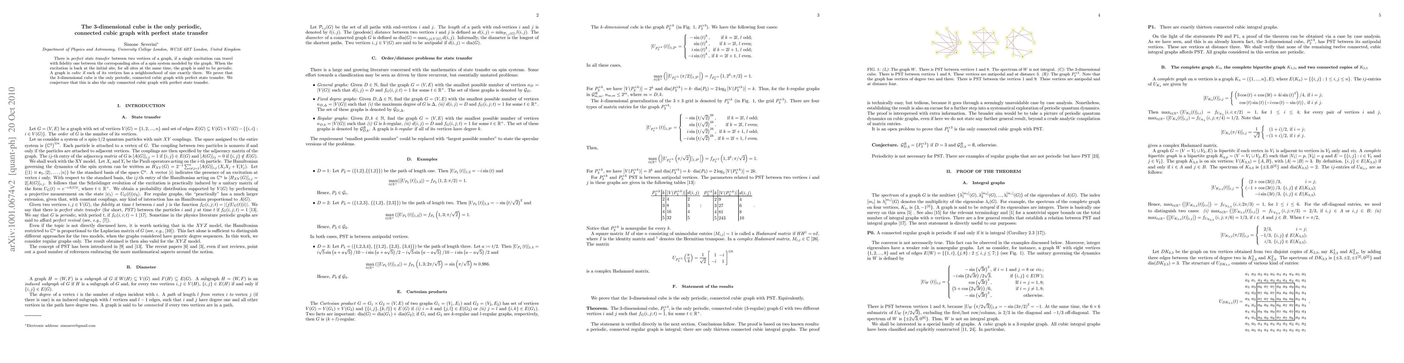 Summary: This research proves that the 3-dimensional cube is the sole periodic, connected cubic graph exhibiting perfect state transfer, and it conjectures this property is unique to this graph among all connected cubic graphs.