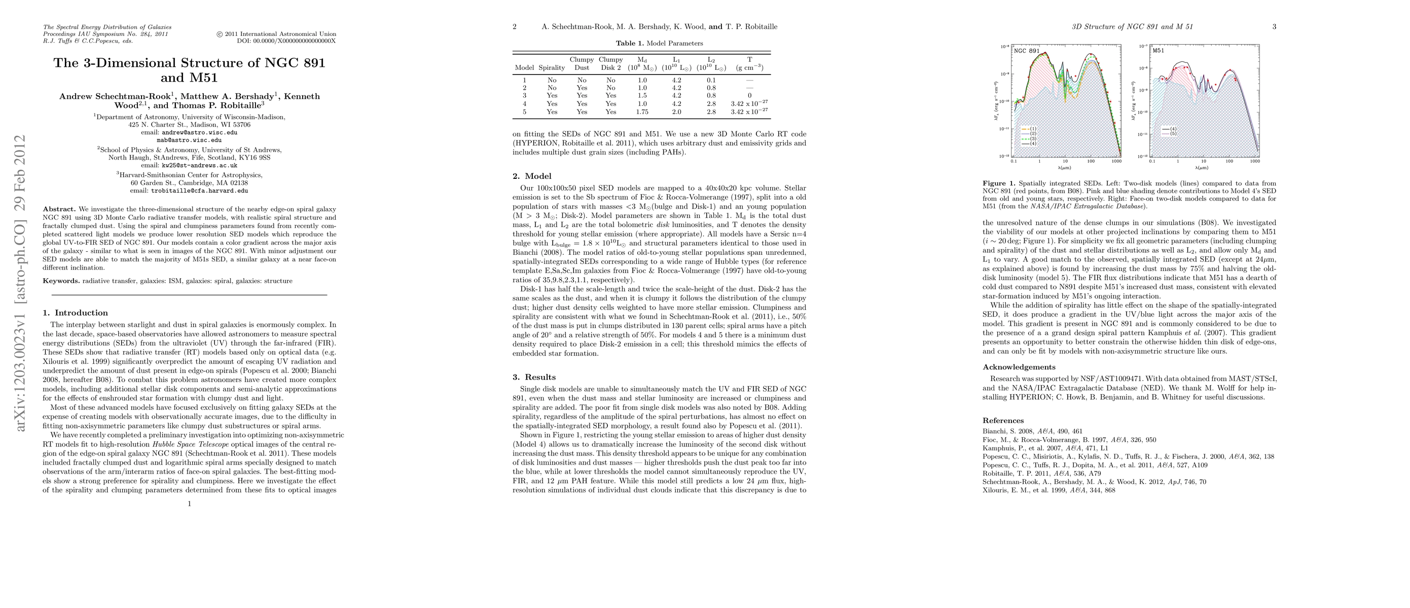 This paper uses 3D Monte Carlo radiative transfer models to study the three-dimensional structure of NGC 891, revealing a realistic spiral pattern and fractally clumped dust. The models successfully reproduce NGC 891's UV-to-FIR spectral energy distribution (SED) and show a color gradient across the galaxy's major axis, similar to observed images. The same models can also match most of M51's SED, indicating similar structural characteristics in a face-on galaxy.