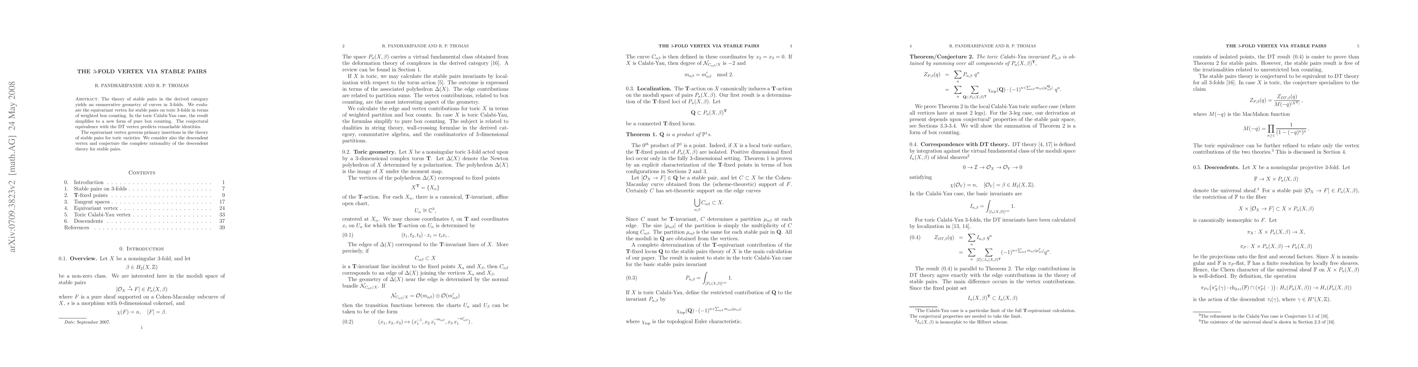 The paper evaluates the equivariant vertex for stable pairs on toric 3-folds using weighted box counting, deriving a simplified form in the toric Calabi-Yau case. It conjectures equivalence with the DT vertex, predicting significant identities and discussing the rationality of descendent theory for stable pairs.