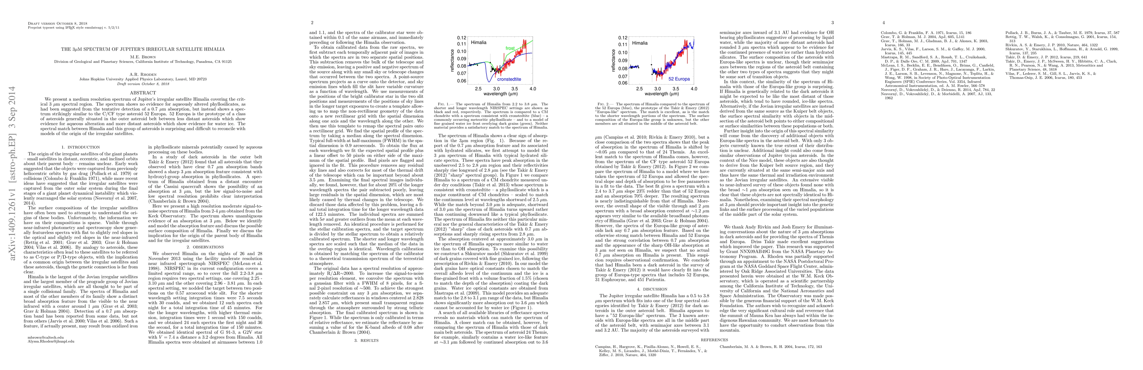 We present a medium resolution spectrum of Jupiter's irregular satellite Himalia covering the critical 3 $\mu$m spectral region. The spectrum shows no evidence for aqueously altered phyllosilicates, as had been suggested from the tentative detection of a 0.7 $\mu$m absorption, but instead shows a spectrum strikingly similar to the C/CF type asteroid 52 Europa. 52 Europa is the prototype of a class of asteroids generally situated in the outer asteroid belt between less distant asteroids which show evidence for aqueous alteration and more distant asteroids which show evidence for water ice. The spectral match between Himalia and this group of asteroids is surprising and difficult to reconcile with models of the origin of the irregular satellites.