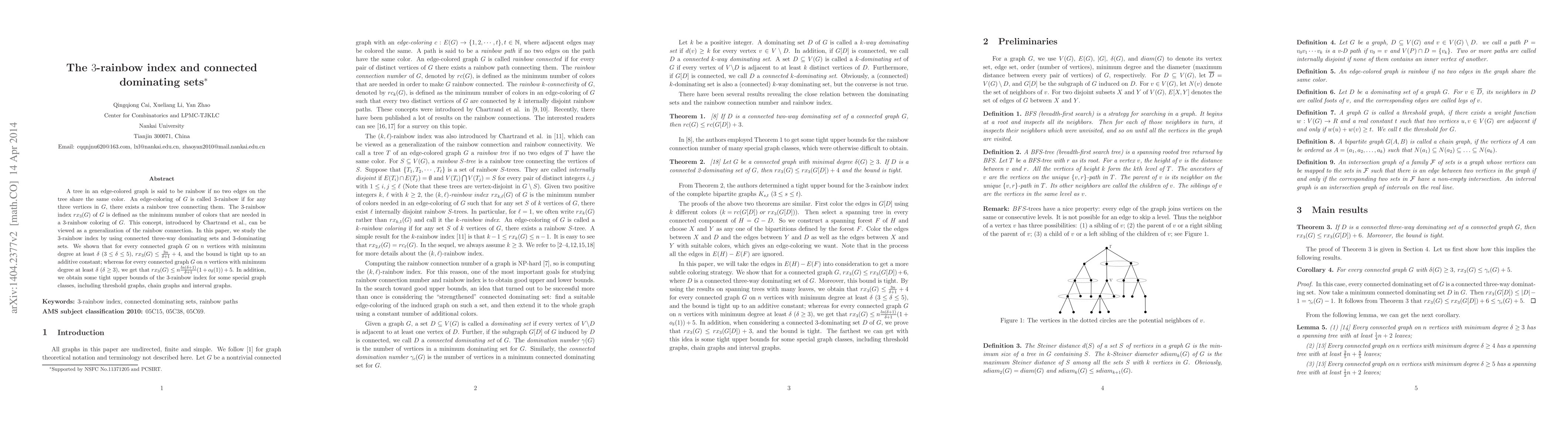 A tree in an edge-colored graph is said to be rainbow if no two edges on the tree share the same color. An edge-coloring of $G$ is called 3-rainbow if for any three vertices in $G$, there exists a rainbow tree connecting them. The 3-rainbow index $rx_3(G)$ of $G$ is defined as the minimum number of colors that are needed in a 3-rainbow coloring of $G$. This concept, introduced by Chartrand et al., can be viewed as a generalization of the rainbow connection. In this paper, we study the 3-rainbow index by using connected three-way dominating sets and 3-dominating sets. We shown that for every connected graph $G$ on $n$ vertices with minimum degree at least $\delta$ ($3\leq\delta\leq5$), $rx_{3}(G)\leq \frac{3n}{\delta+1}+4$, and the bound is tight up to an additive constant; whereas for every connected graph $G$ on $n$ vertices with minimum degree at least $\delta$ ($\delta\geq3$), we get that $rx_{3}(G)\leq n\frac{ln(\delta+1)}{\delta+1}(1+o_{\delta}(1))+5$. In addition, we obtain some tight upper bounds of the 3-rainbow index for some special graph classes, including threshold graphs, chain graphs and interval graphs.