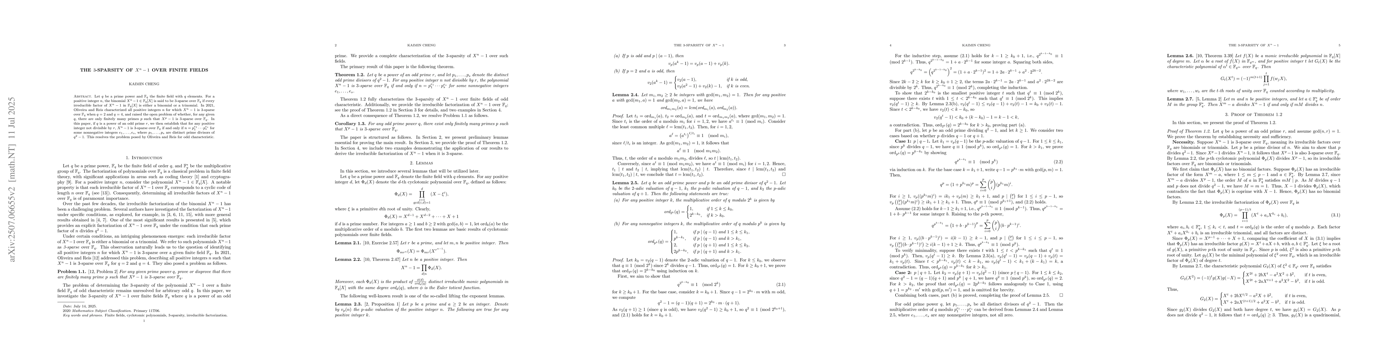 Let $q$ be a prime power and $\mathbb{F}_q$ the finite field with $q$ elements. For a positive integer $n$, the binomial $X^n - 1 \in \mathbb{F}_q[X]$ is said to be $3$-sparse over $\mathbb{F}_q$ if every irreducible factor of $X^n-1$ in $\mathbb{F}_q[X]$ is either a binomial or a trinomial. In 2021, Oliveira and Reis characterized all positive integers $n$ for which $X^n-1$ is $3$-sparse over $\mathbb{F}_q$ when $q = 2$ and $q = 4$, and raised the open problem of whether, for any given $q$, there are only finitely many primes $p$ such that $X^p-1$ is $3$-sparse over $\mathbb{F}_q$. In this paper, if $q$ is a power of an odd prime $r$, we then establish that for any positive integer not divisible by $r$, $X^n-1$ is $3$-sparse over $\mathbb{F}_q$ if and only if $n =p_1^{e_1} \cdots p_s^{e_s}$ for some nonnegative integers $e_1, \dots, e_s$, where $p_1, \dots, p_s$ are distinct prime divisors of $q^2 - 1$. This resolves the problem posed by Oliveira and Reis for odd characteristic.