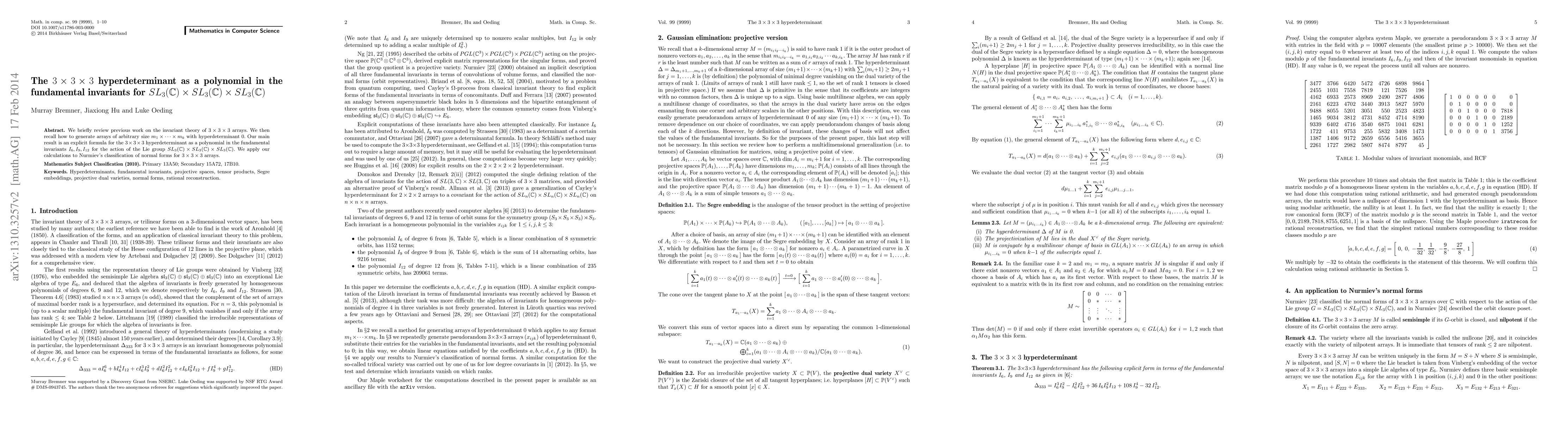 We briefly review previous work on the invariant theory of 3 x 3 x 3 arrays. We then recall how to generate arrays of arbitrary size m_1 x ... x m_k with hyperdeterminant 0. Our main result is an explicit formula for the 3 x 3 x 3 hyperdeterminant as a polynomial in the fundamental invariants of degrees 6, 9 and 12 for the action of the Lie group SL(3,C) x SL(3,C) x SL(3,C). We apply our calculations to Nurmiev's classification of normal forms for 3 x 3 x 3 arrays.