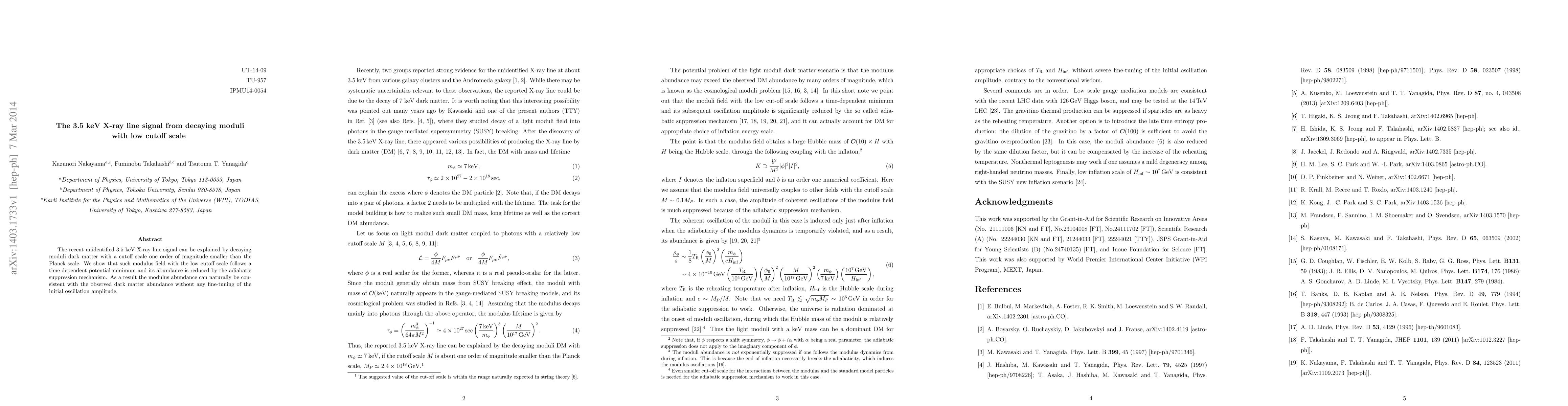 The paper proposes that the 3.5 keV X-ray line signal originates from decaying moduli dark matter with a cutoff scale much lower than the Planck scale, explaining the observed dark matter abundance through a time-dependent potential minimum and adiabatic suppression.