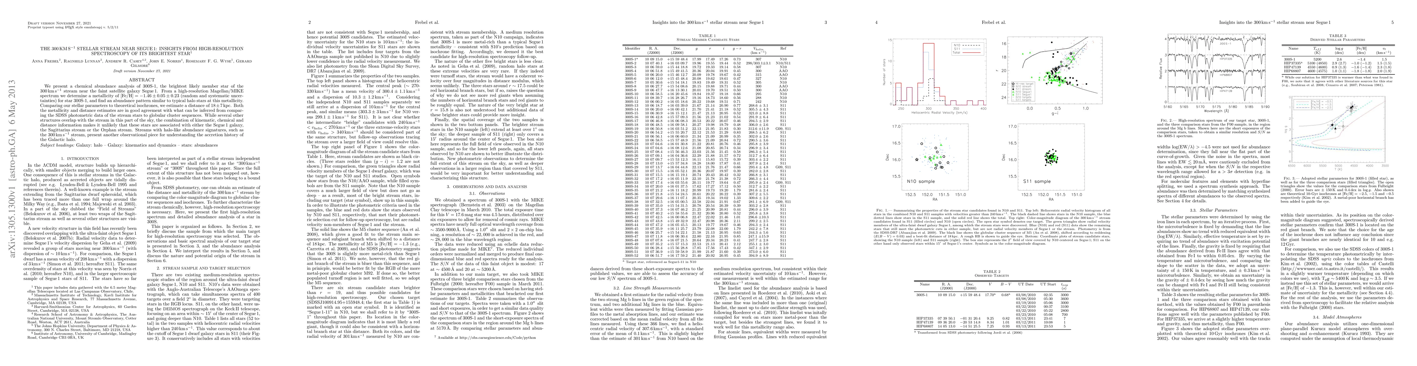 This paper analyzes the chemical abundance of the brightest star in the 300 km/s stellar stream near Segue 1, finding a metallicity of [Fe/H] = -1.46 and a distance estimate of 18 +- 7 kpc. The star's properties suggest it is not associated with nearby structures like Segue 1 or Sagittarius, contributing to understanding the Galactic halo's accretion history.