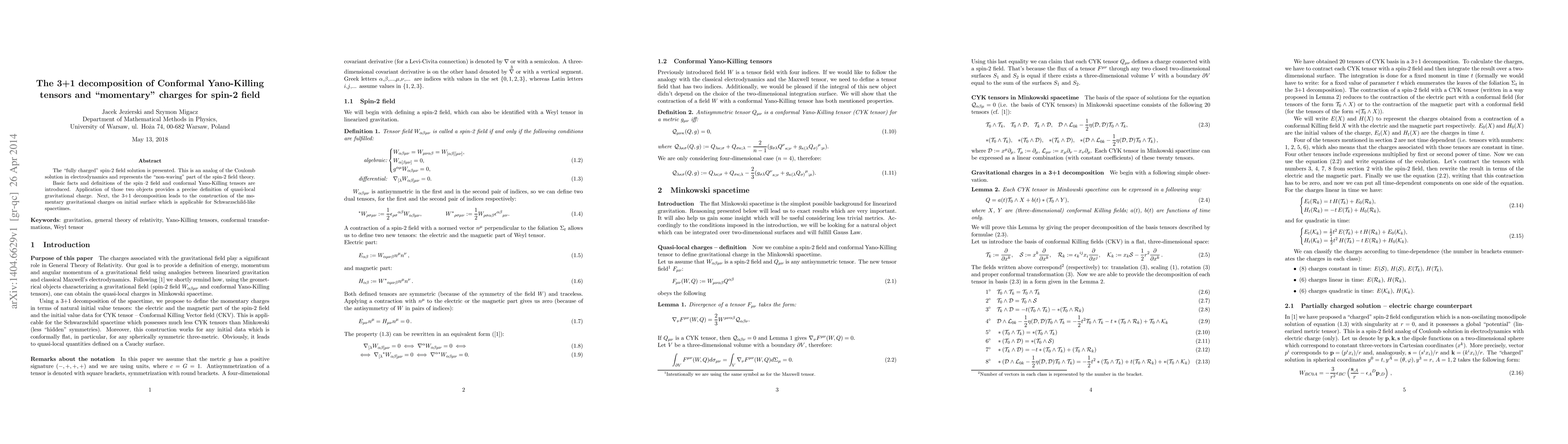 The "fully charged" spin-2 field solution is presented. This is an analog of the Coulomb solution in electrodynamics and represents the "non-waving" part of the spin-2 field theory. Basic facts and definitions of the spin--2 field and conformal Yano-Killing tensors are introduced. Application of those two objects provides a precise definition of quasi-local gravitational charge. Next, the 3+1 decomposition leads to the construction of the momentary gravitational charges on initial surface which is applicable for Schwarzschild-like spacetimes.